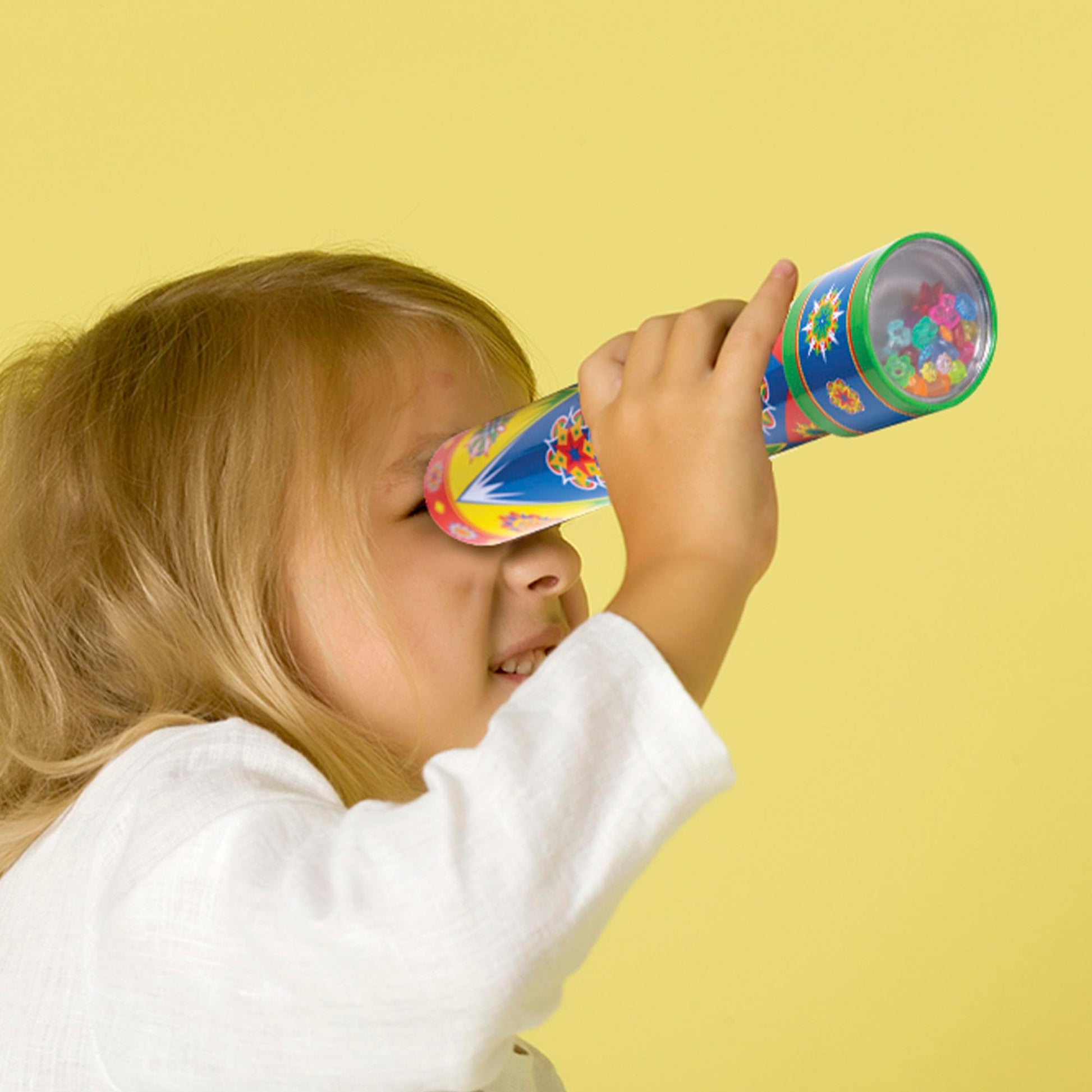 Kaleidoscopes, from the Greek word for 'beautiful form to see', have been fascinating children since their invention in 1816. And they still create wonder and delight in today's child. This tin Kaleidoscope from Schylling Toys, the world leader in traditional toys and classic fun lets children see the world in a new and more artistic way. Point toward the light and experience a swirling explosion of brilliant colors. Twist the separate turning cell and create vibrant and fantastical moving color patterns. Each turn creates a magical, intricate and iridescent mosaic that will dazzle and delight. Made out of metal, you get the timeless tin toy feel that is lacking in plastic and cardboard kaleidoscopes. As educational as it is entertaining, this classic kid's kaleidoscope fosters creativity, imagination and constant fascination.