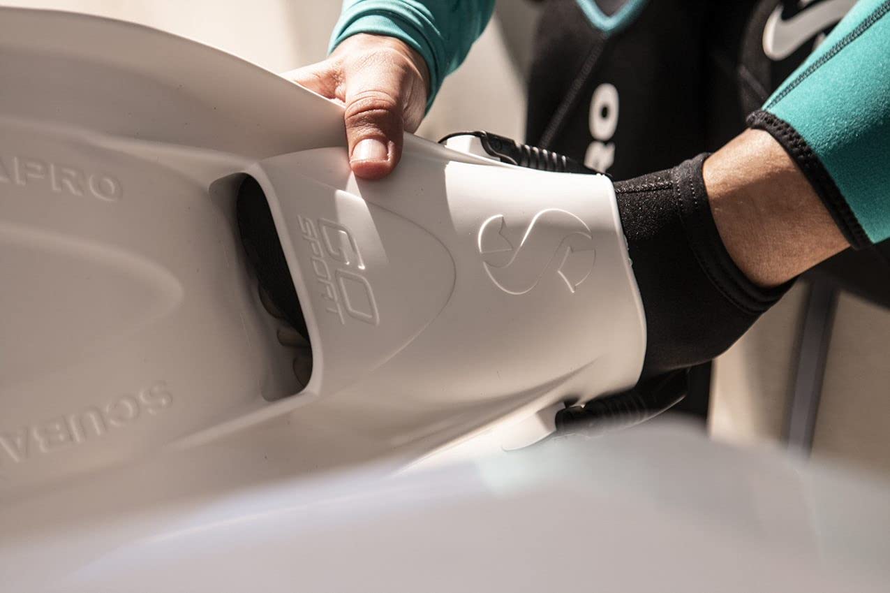 Details: Lightweight yet virtually indestructible, SCUBAPRO's Go Sport Fin is a fast and nimble performer in the water. SCUBAPRO's “boot-fit” design features a replaceable, self-adjusting bungee heel strap that slips easily over boots, ideal for divers who frequently negotiate rocky shore entries. The fins' ultra-strong 100% Monprene construction won't delaminate, break, or tear even after years of use, making it ideal for long-term, heavy-duty use. Performance features like a 25-degree pre-angled blade and power bars on the underside of the rail make the fins fast, powerful, stable, and maneuverable with minimal effort. Bring the fins to your favorite tropical waters with its compact, lightweight design, which easily fits in AITA carry-on compliant luggage. Driven to constantly innovate and improve the diving experience, SCUBAPRO builds high-quality equipment for the work, sport, and lifestyle of people whose passion is found below the surface. Mix and match equipment with a variety of colors; weighs roughly 2.5 pounds (pair); one-year warranty.