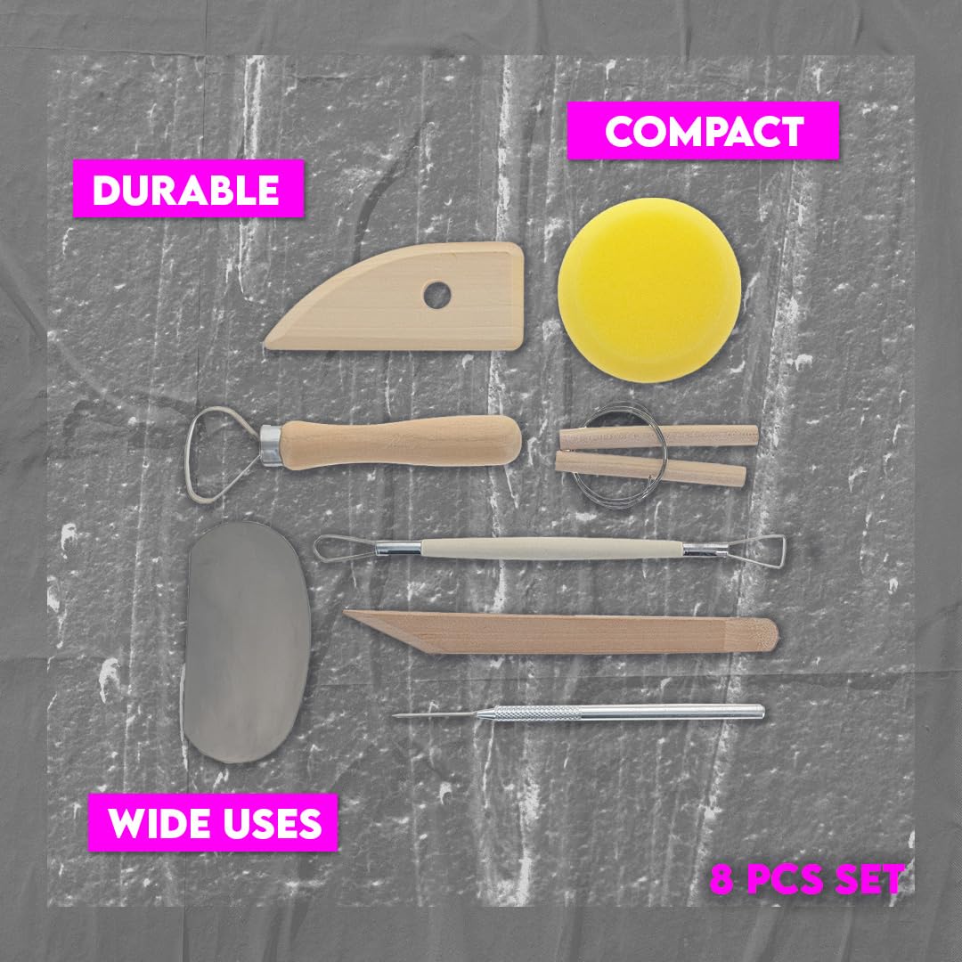 COMPLETE KIT- This 8-piece pottery tool set is perfect for beginners and experts alike, providing comprehensive options for cutting, shaping, decorating, and smoothing various types of clay.