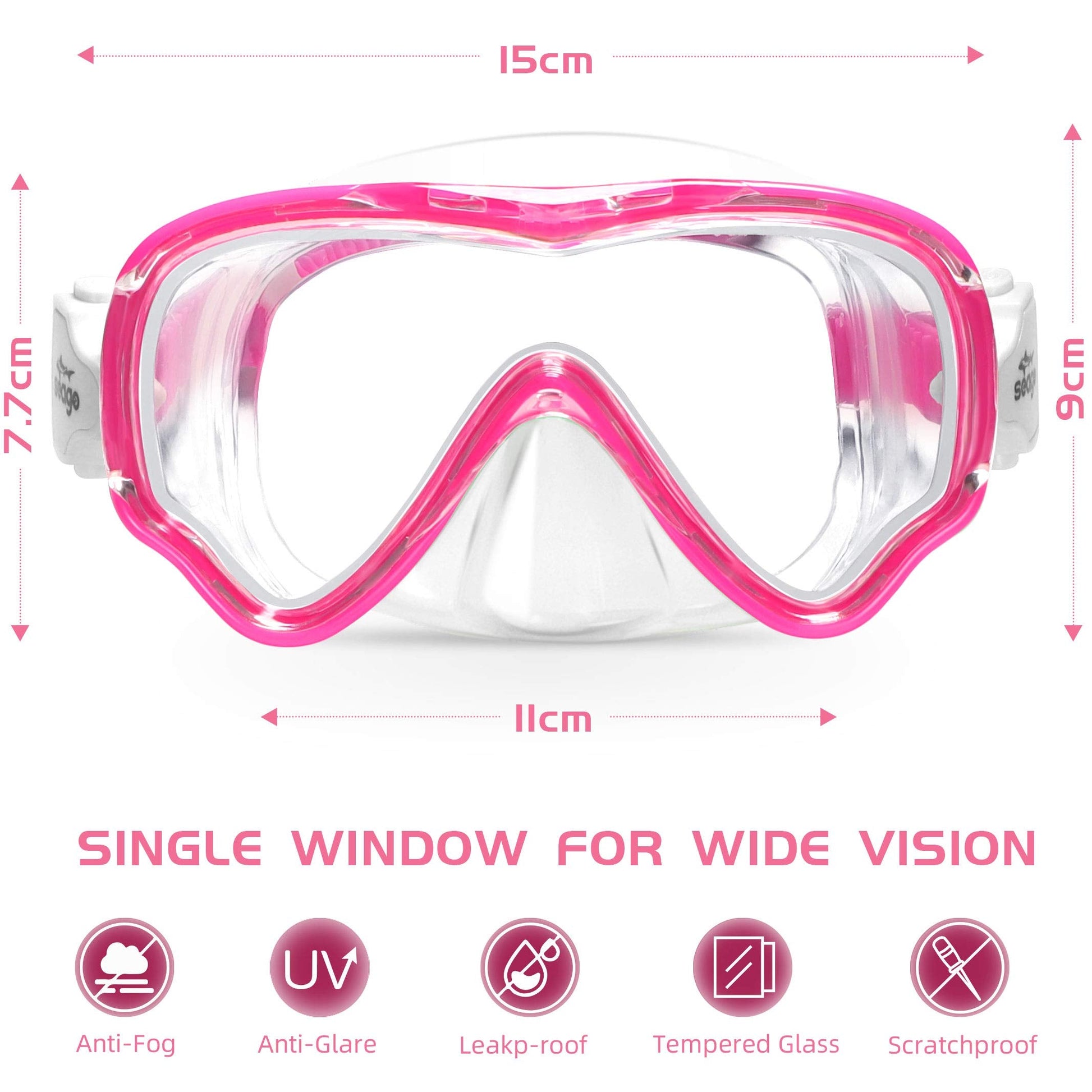 • 🐋【Easy headstrap adjustment of snorkeling masks】Seago water mask fit a range of 5-15 years old children faces. The straps of scuba diving mask can be adjusted by easily pressing masks' button buckle and the buckle will hold the strap securely in place without creeping down in the water. Tips to avoid the leakage: Tighten the mask and you can feel that the silicone skirt is fully absorbed on your face.