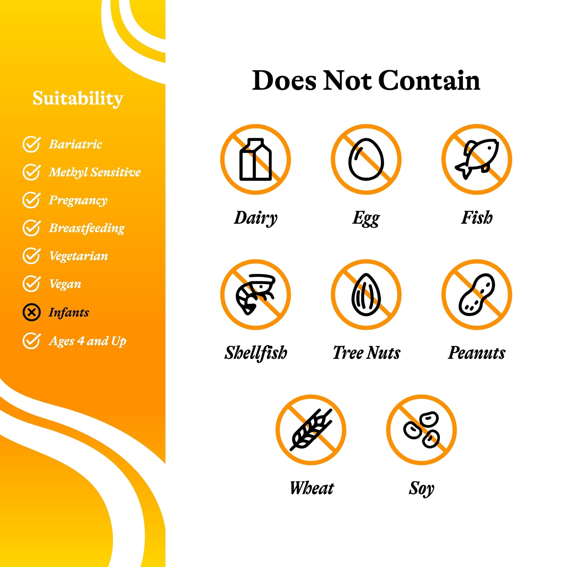 • Free from: Eggs, fish, gluten, GMO, milk, peanuts, shellfish, soy, tree nuts, wheat, artificial colors, artificial flavors, and artificial preservatives