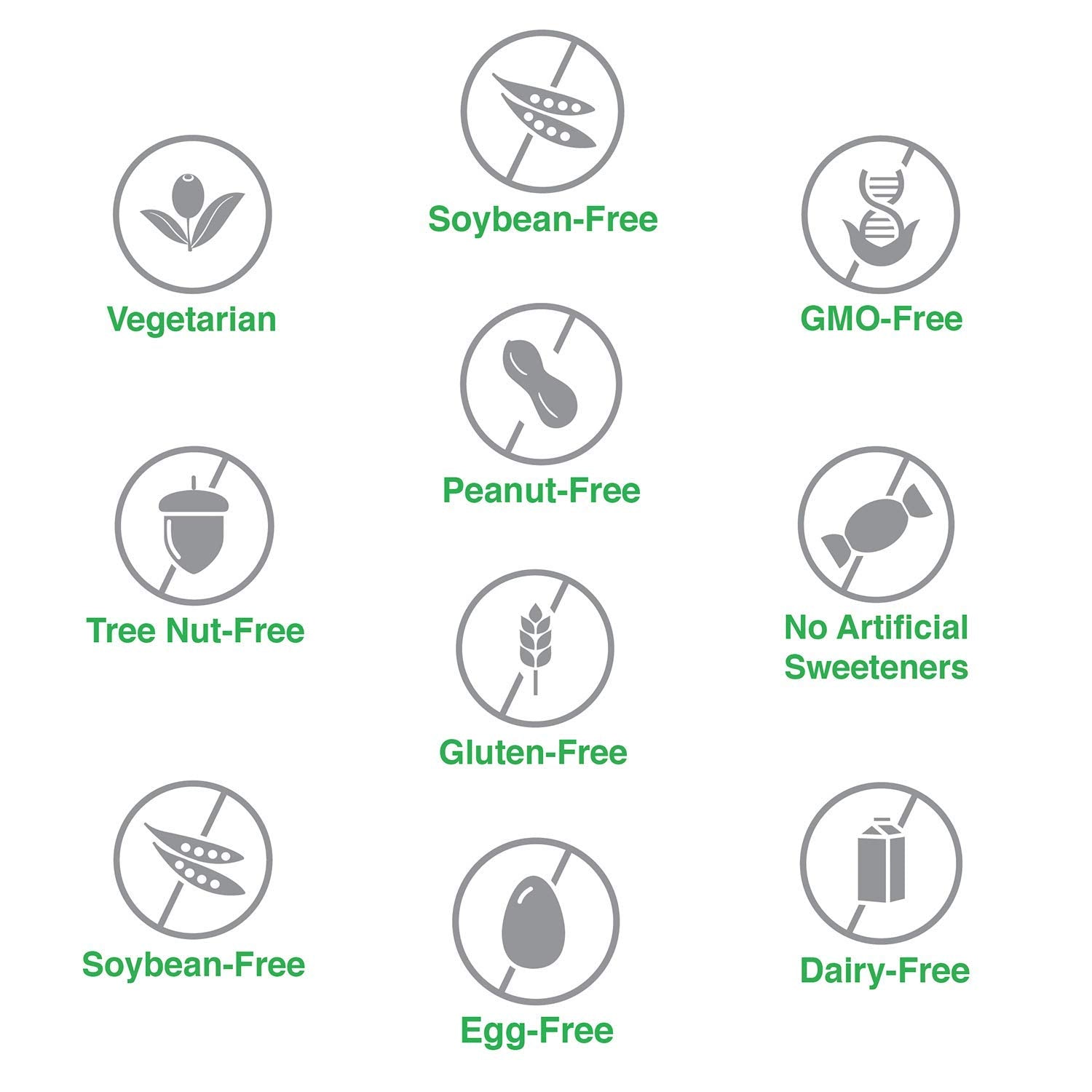 • Free from: Eggs, fish, gluten, GMO, milk, peanuts, shellfish, soy, tree nuts, wheat, corn, artificial colors, artificial flavors, and artificial preservatives