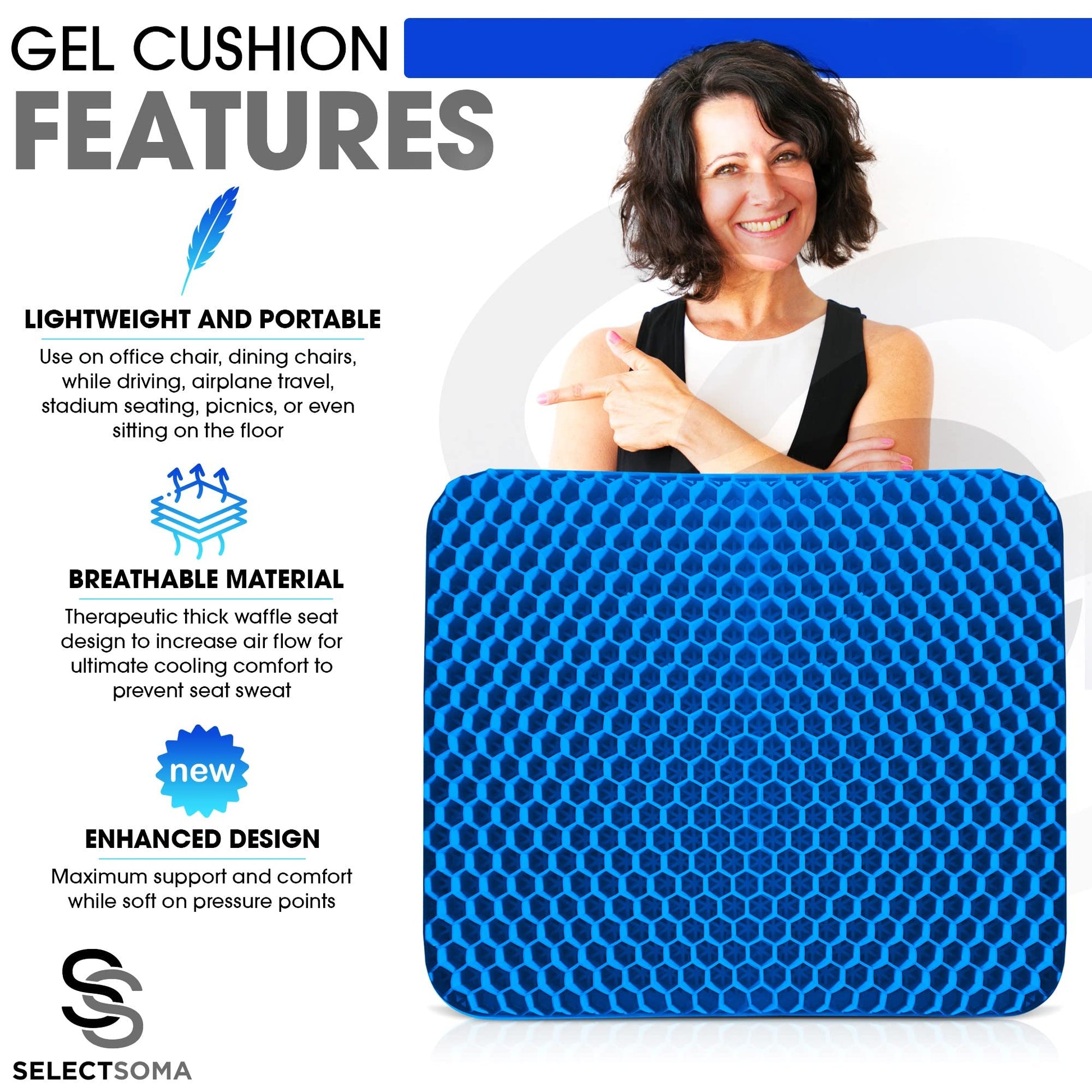 • While other Gel Cushions are too small, uncomfortable, and not enough support, the SelectSoma Enhanced Blue High Grade Gel Cushion with Double Thickness is Large and provides Maximum Support for Complete Comfort while being Soft on Pressure Points.