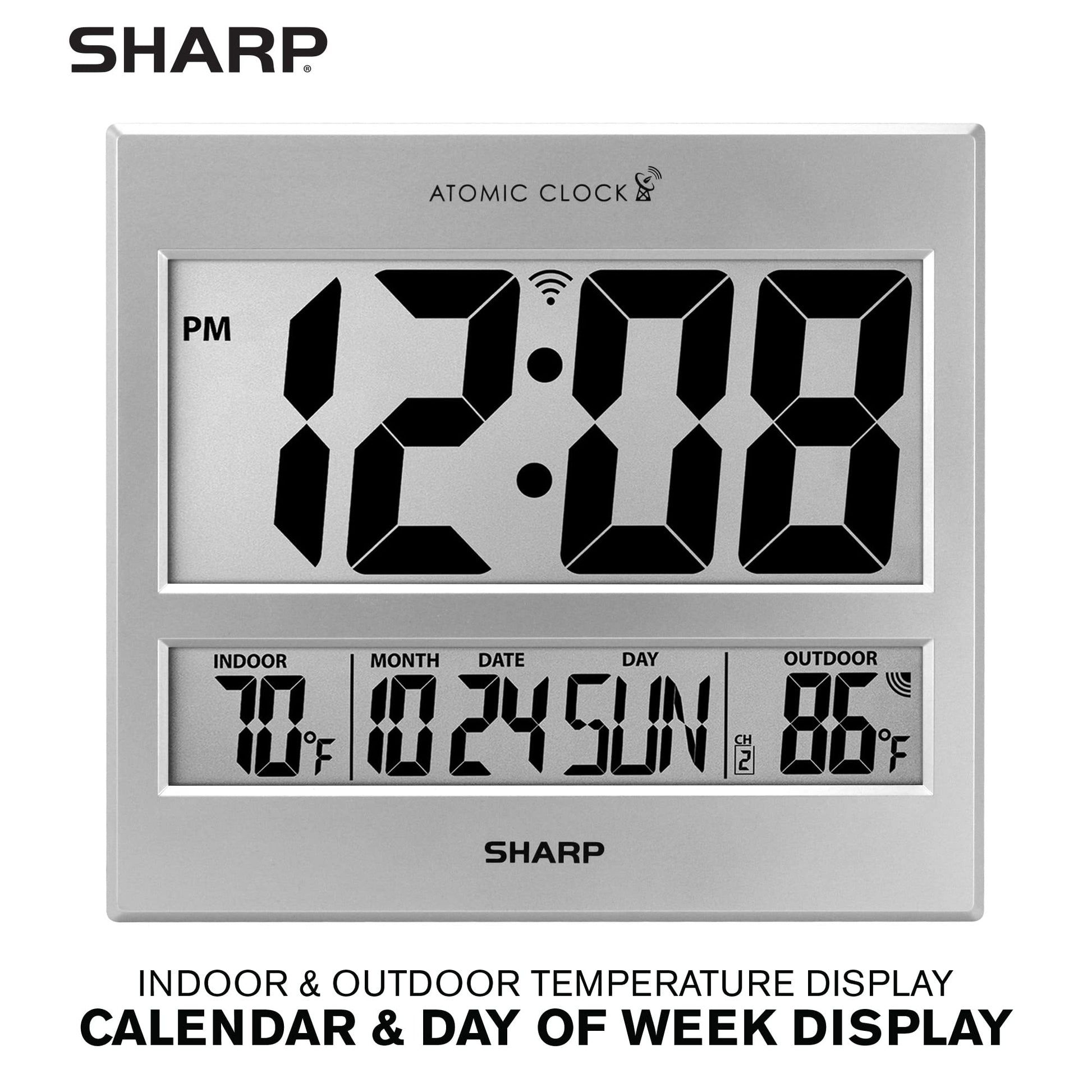 Sharp Atomic Clock - Atomic Accuracy - Never Needs Setting! -Silver Tech Style - Jumbo 3" Easy to Read Numbers - Indoor/Outdoor Temperature Display with Wireless Outdoor Sensor - Easy Set-Up!