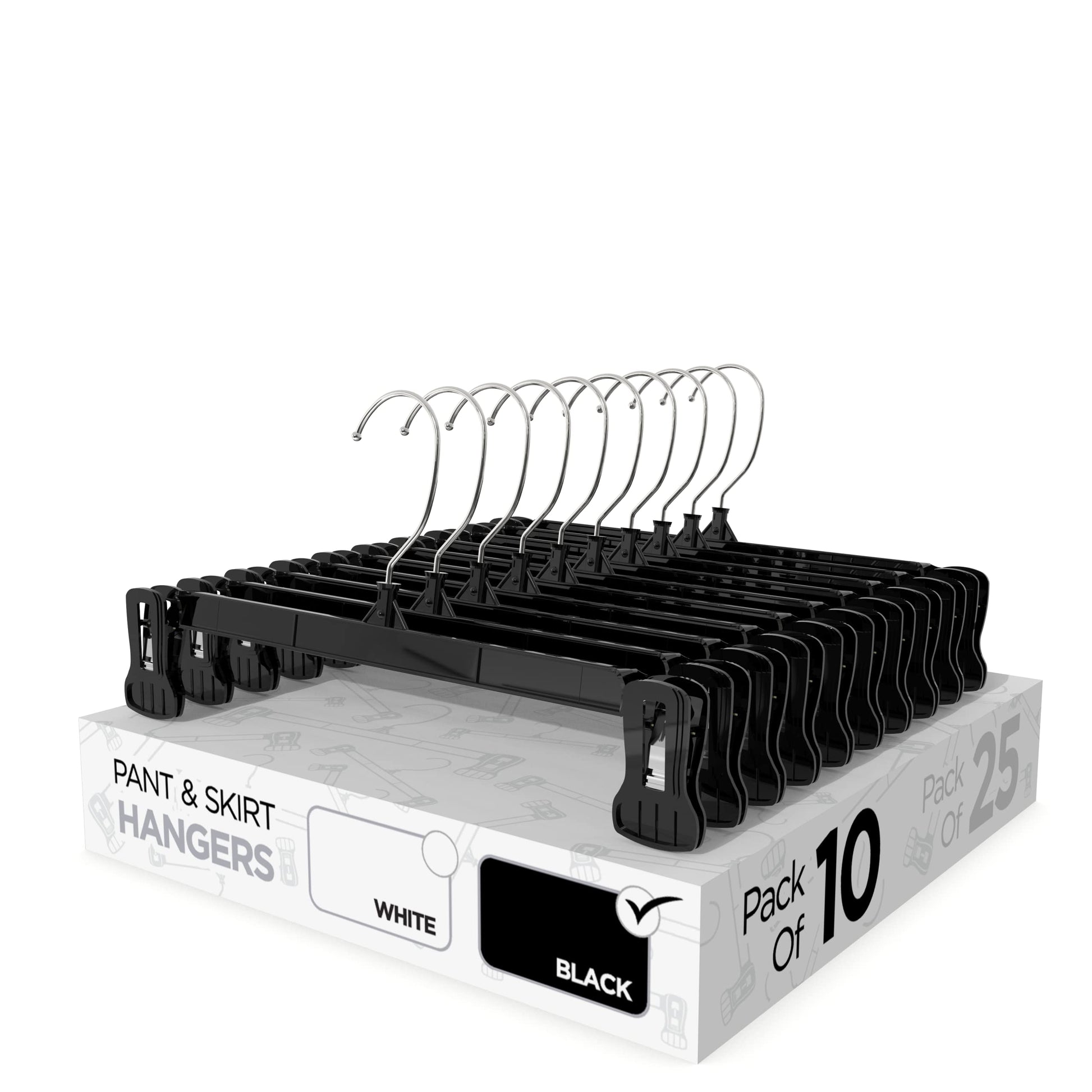 • πŸ‘— OPTIMIZED DESIGN: Constructed from strong and sturdy plastic, our pant & skirt hangers will not warp or break. Large non-slip clips can hold even the heaviest garments like jeans and coats with ease.
