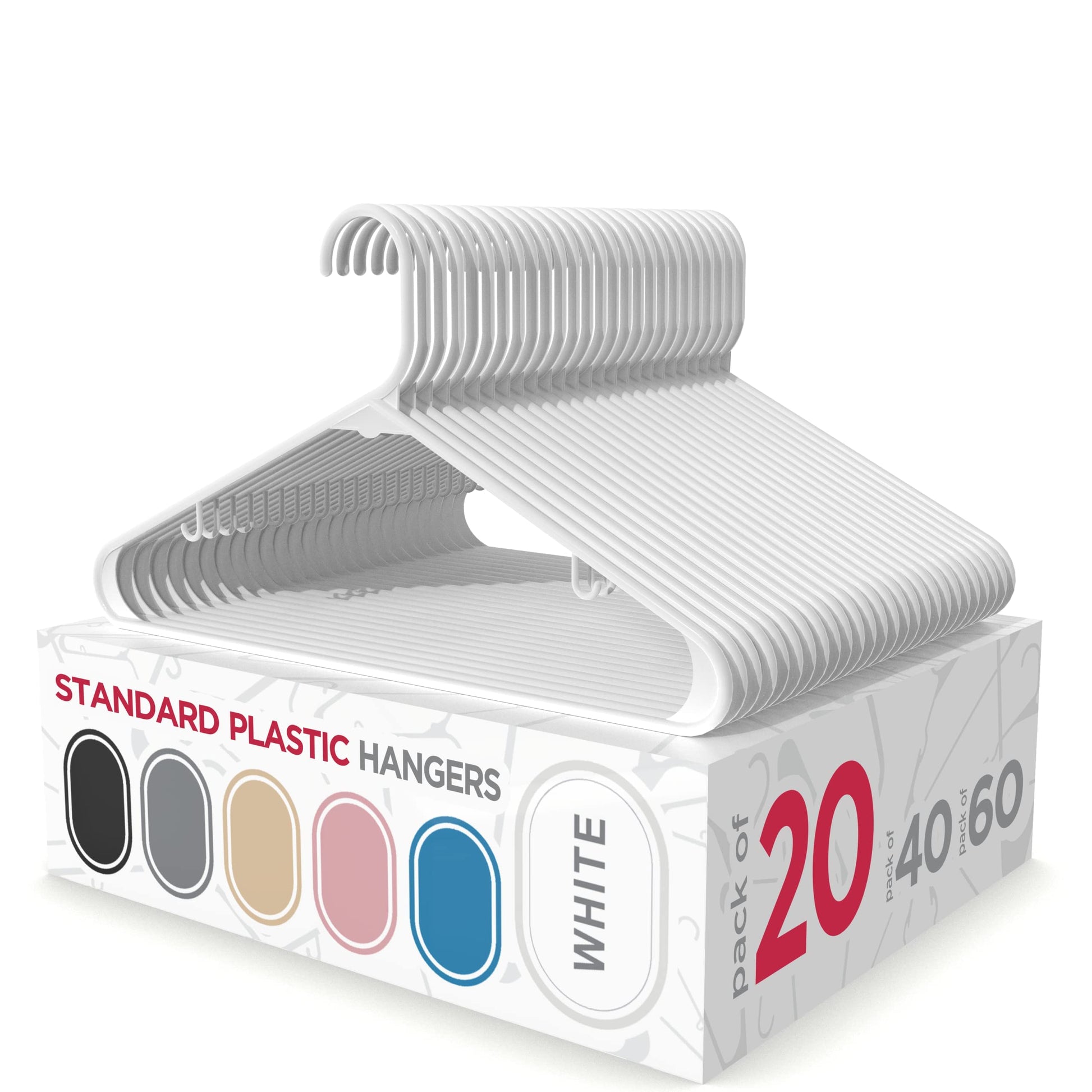 • πŸ‘š AFFORDABLE & CONVENIENT: Affordable and convenient plastic hangers for any occasion. Our hangers come in variety packs of 20, 40 and 60 options, to make organizing your closet & cabinets a breeze!