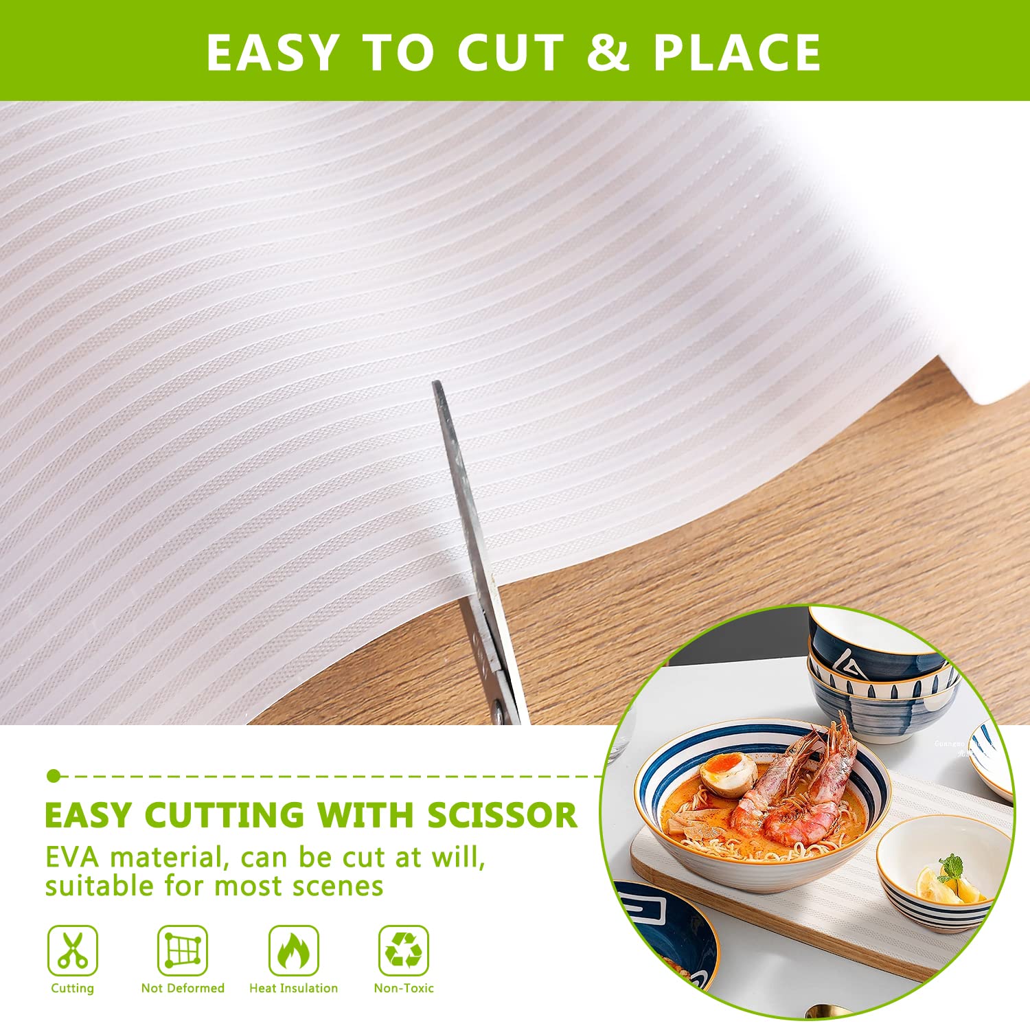 • 🎁【SAFE AND DURABLE MATERIAL】The shelf liner is made of high quality food-grade EVA material, which is super soft and durable. It is totally odor free and BPA free. So it can directly contact fruits and vegetables and protect your health. What’s more, the EVA plastic used is strong and durable. It can serve for several years by daily use. So you don’t have to change it all the time.