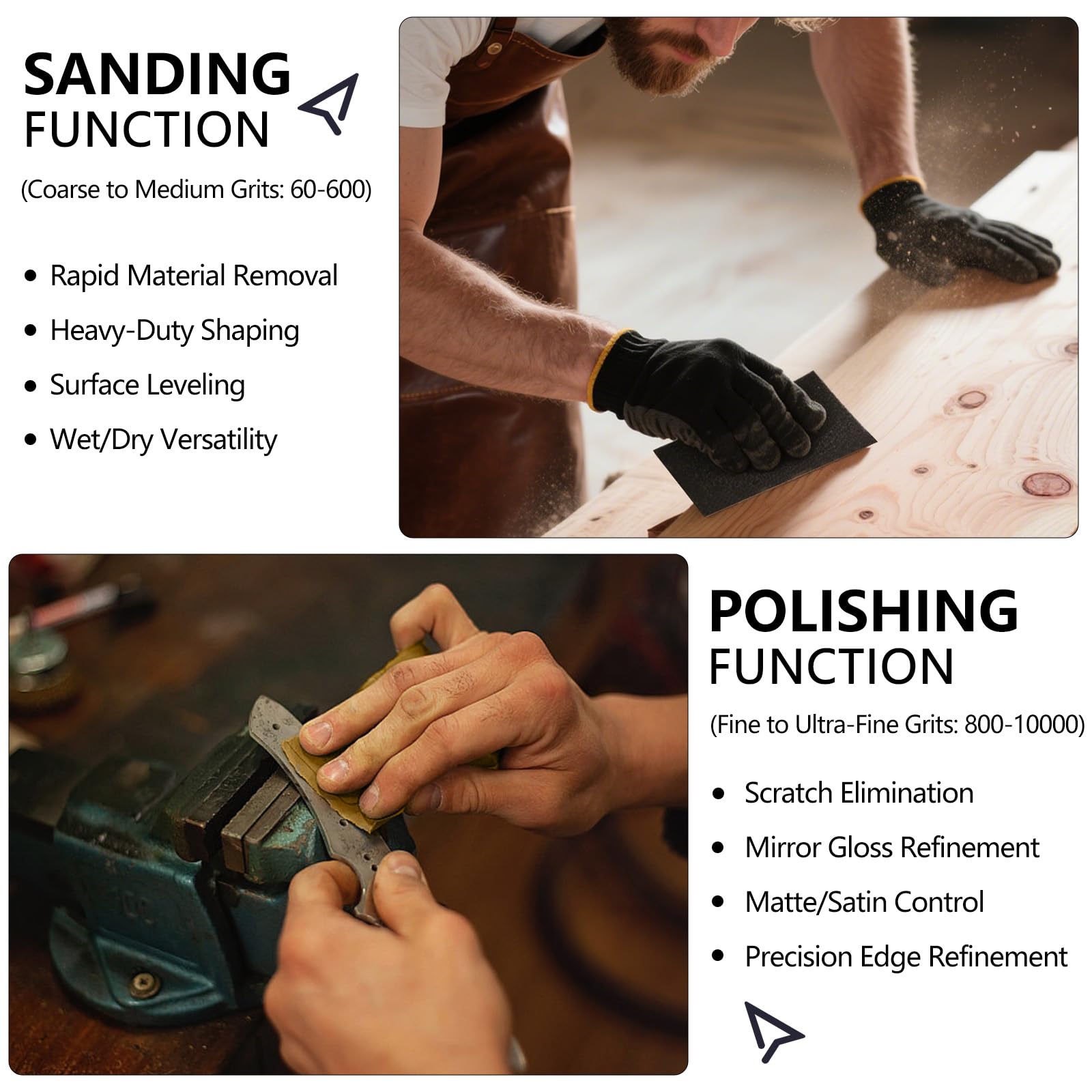 • Wet and Dry Use: It can be utilized for both wet and dry sanding. Wet sanding helps reduce the occurrence of scratches and minimizes dust emissions, while dry sanding offers faster material removal and convenience.