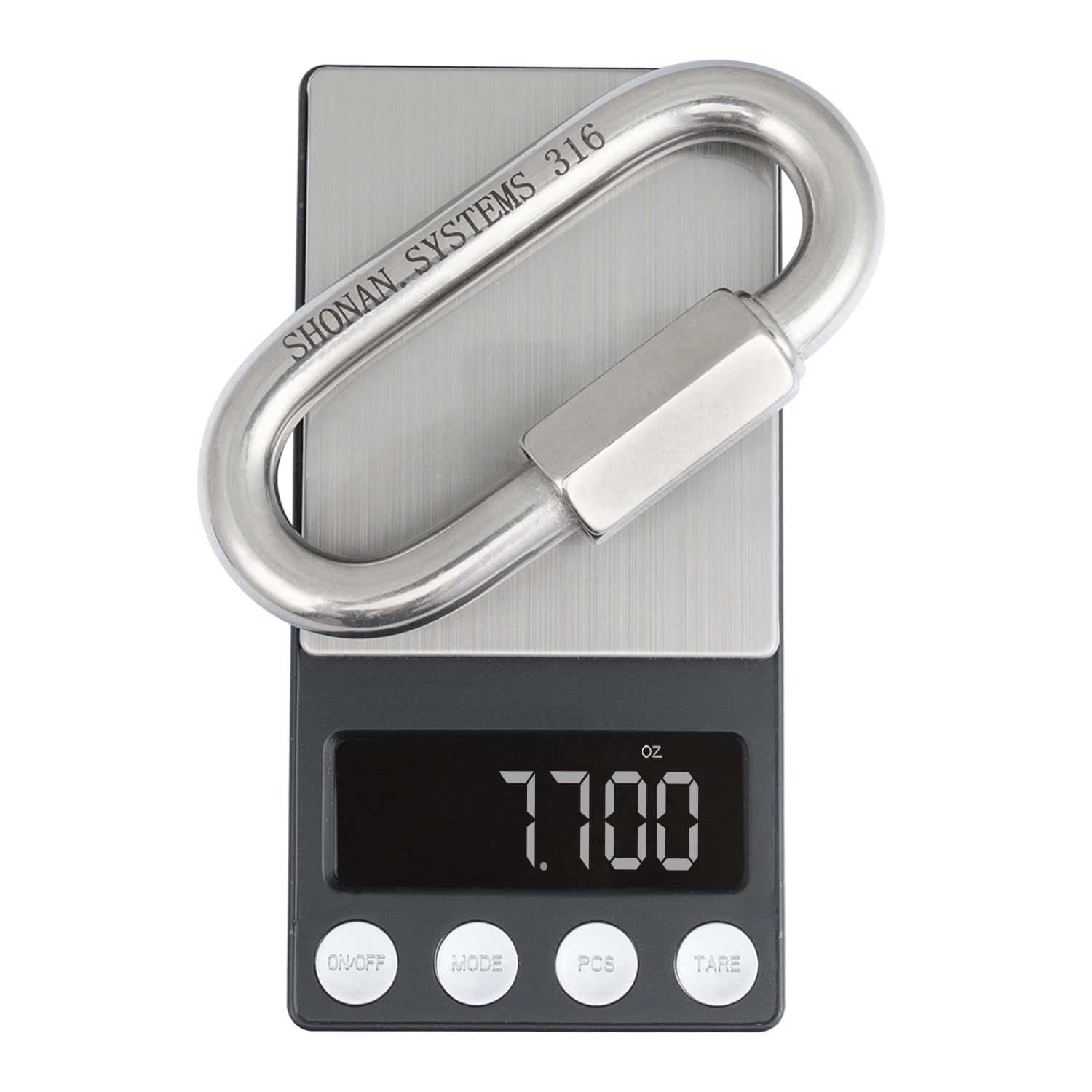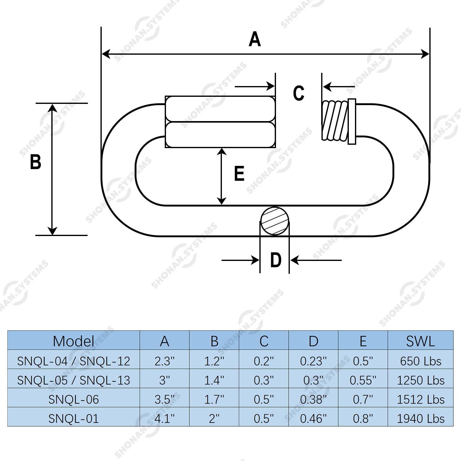• SPECIFICATION: The SHONAN 316 stainless steel heavy-duty locking carabiner (SNQL-01) weighs 7.7 oz (220 grams) and delivers excellent strength and toughness due to high-quality raw materials. Its working capacity reaches up to 1940 pounds. The quick link is larger than most similar products and fits cables with diameters smaller than 0.5 inches. Please refer to the detailed images in the gallery.