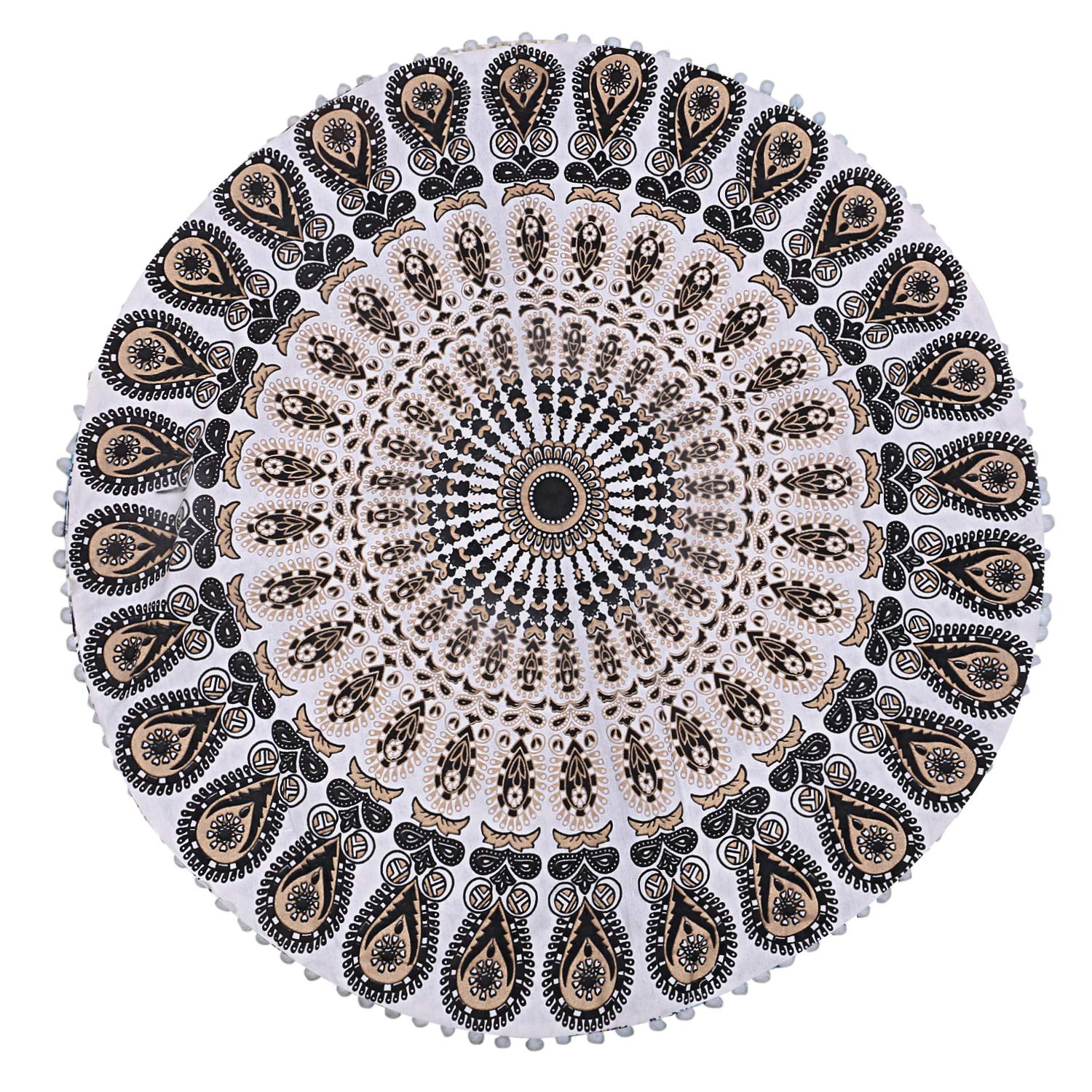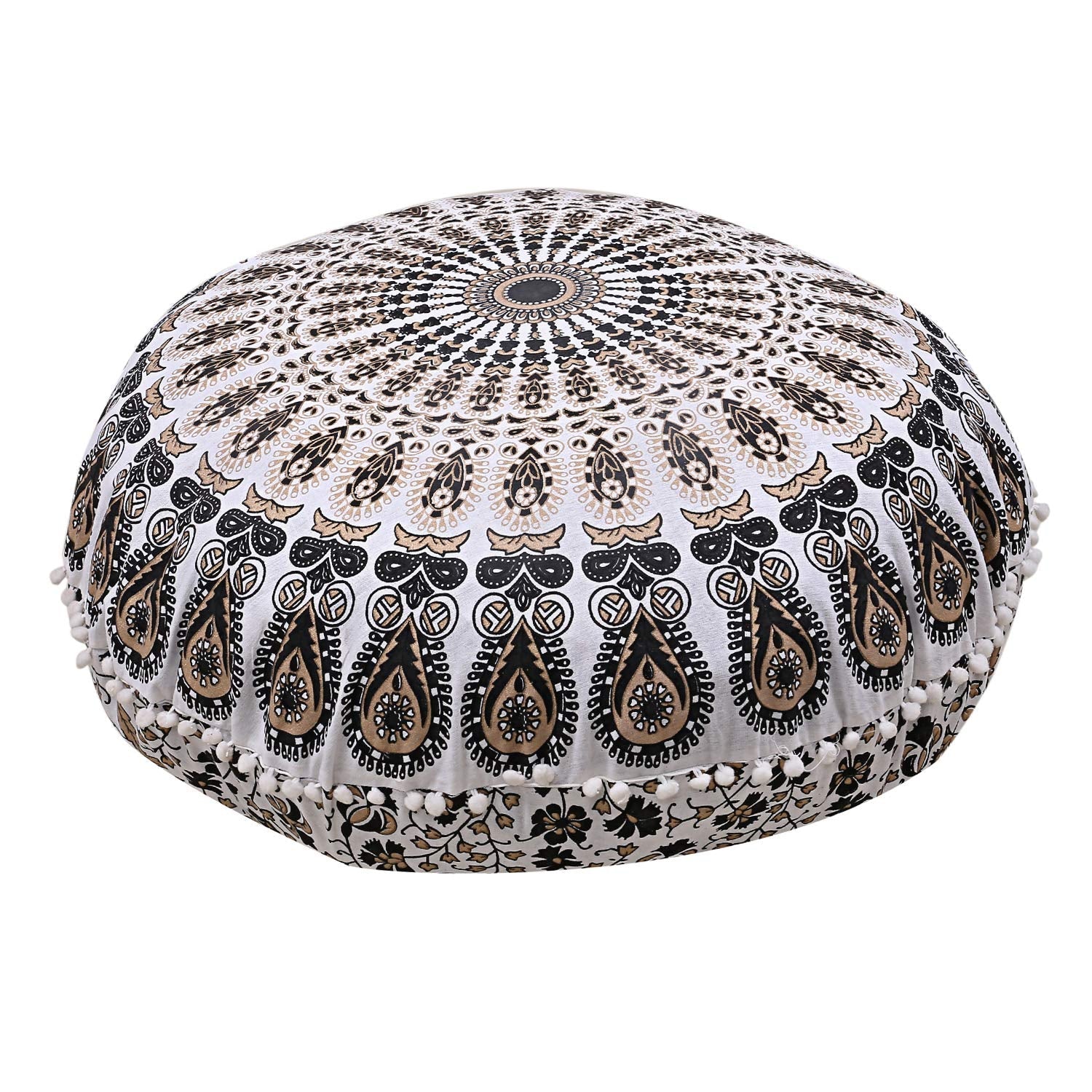 Shubhlaxmifashion Mandala Floor Pillow Cushion Seating Throw Cover Hippie Decorative Bohemian Ottoman Poufs, Pom Pom Pillow Cases,Boho Indian (32 Inches, Gold Black)