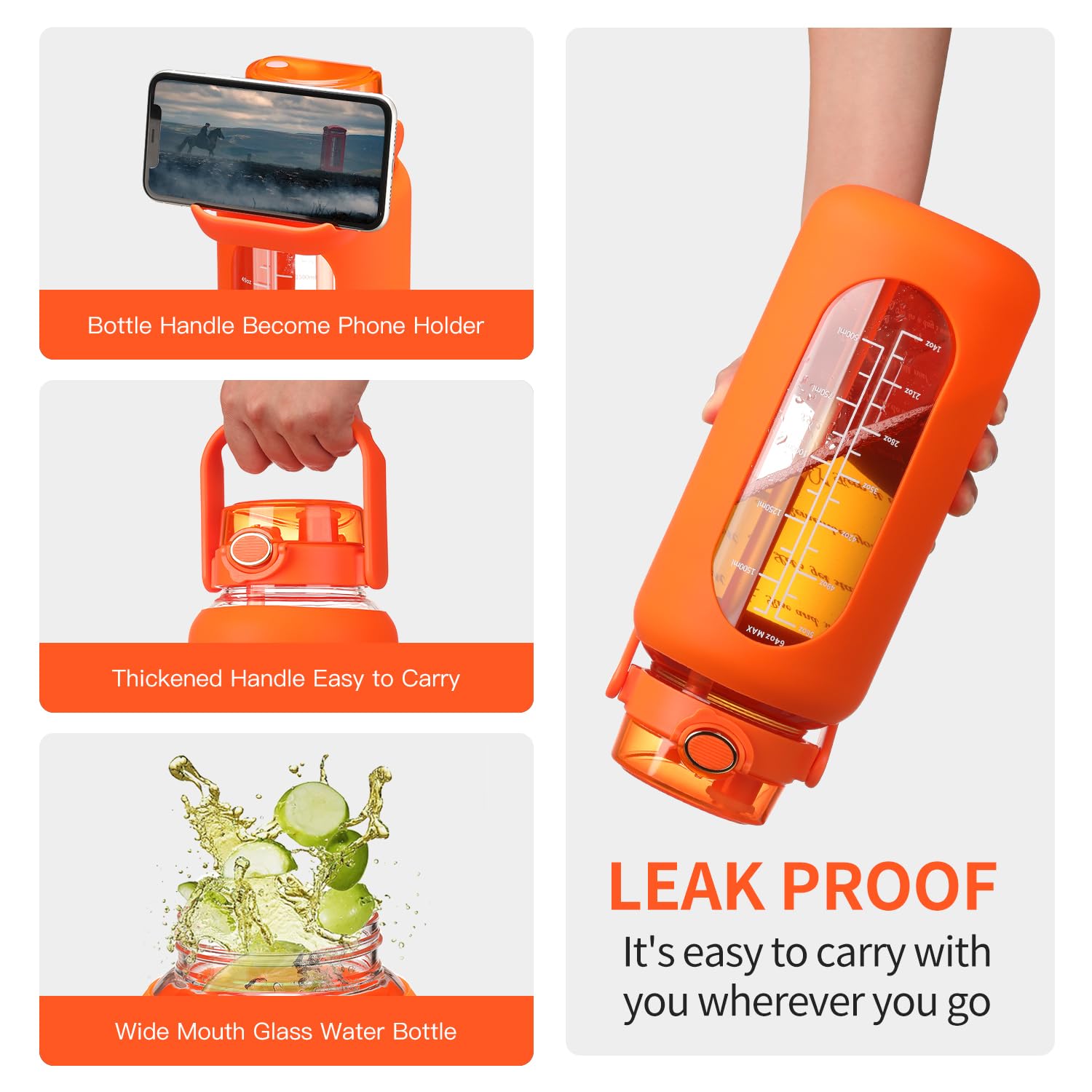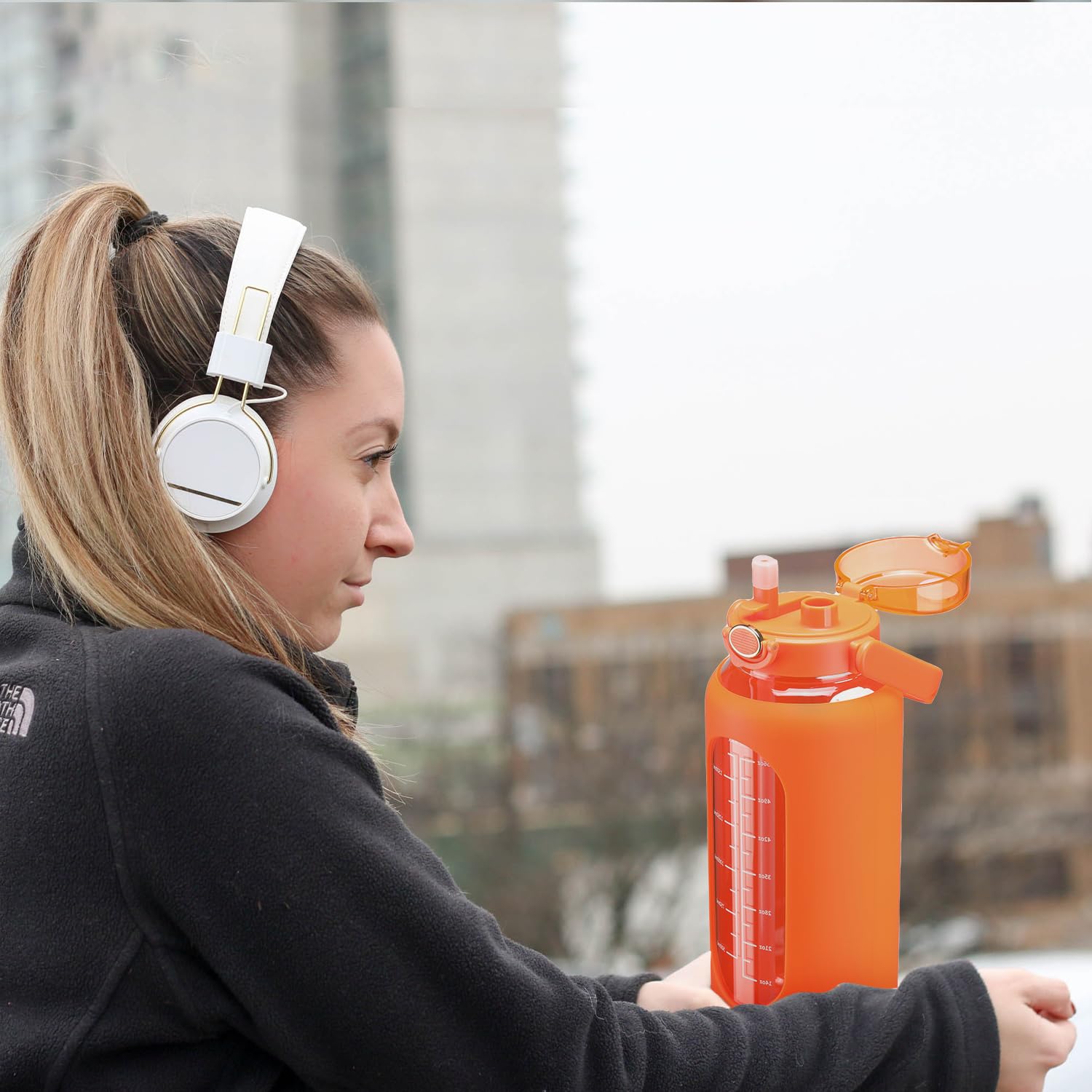 • Glass Water Bottle 64oz :The water jug with straw is designed with high-quality silicone sleeve to protect water bottle from slight bumps. In order to make the half-gallon(2 liters) big gym motivational water bottle easy to carry we have equipped it with handle. Wide-mouth opening make it easy to fill with ice cubes & fruits and daily clean