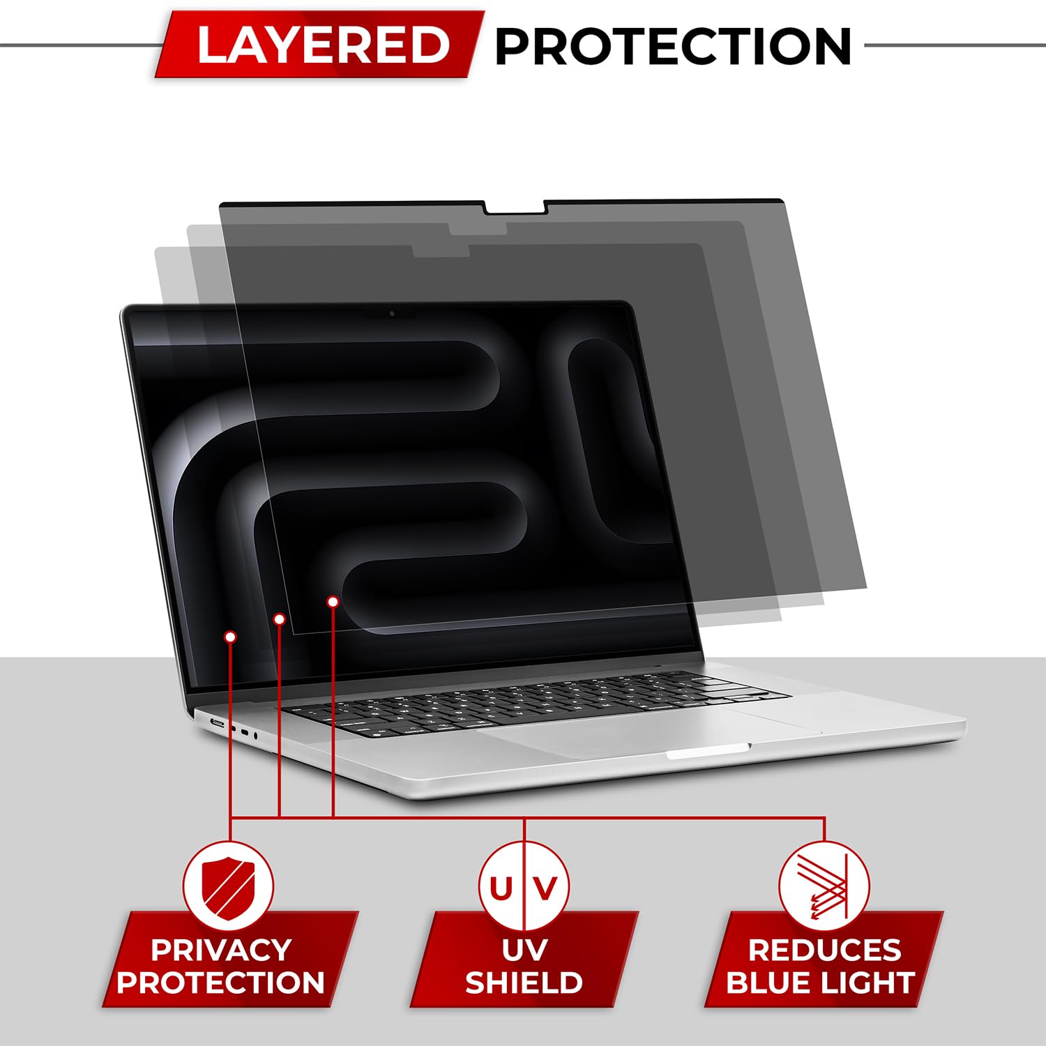 • 【Superior Privacy】- Our advanced multi-layered film filter blacks out your screen when viewing from the side, while maintaining a crystal clear screen straight-on. It also protects your eyes from harmful UV and blue light. [Note: It does not block visibility directly behind you, regardless of the distance.]