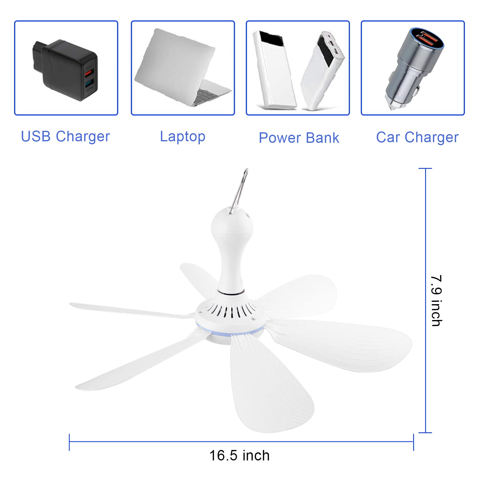 • USB Plug in Fan: USB powered dc ceiling fan, you can power it by Laptop, PC, power bank, usb charger, wall charger with usb port and so on. Lightweight and portable, easy to carry and use. NOTE: The fan MUST be plugged in to work. NOT RECHARGEABLE FAN
