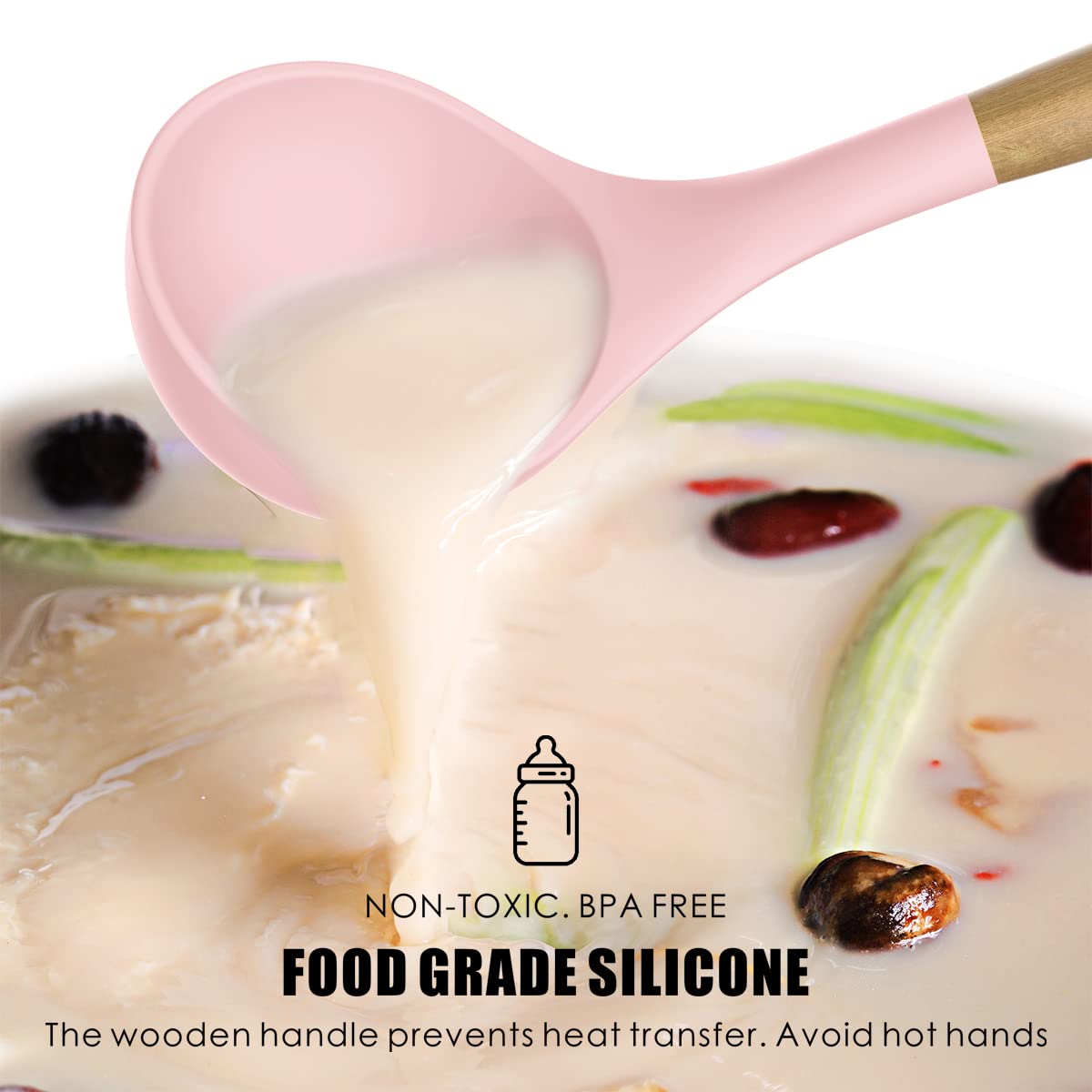 Silicone Kitchen Utensils Set - 446°F Heat Resistant Cooking Utensil Sets, Spatula,Turner,Tongs,Spoon,Brush,Whisk, Wooden Handle Silicone Kitchen Gadgets Tools for Non-Stick Cookware BPA Free (Pink)