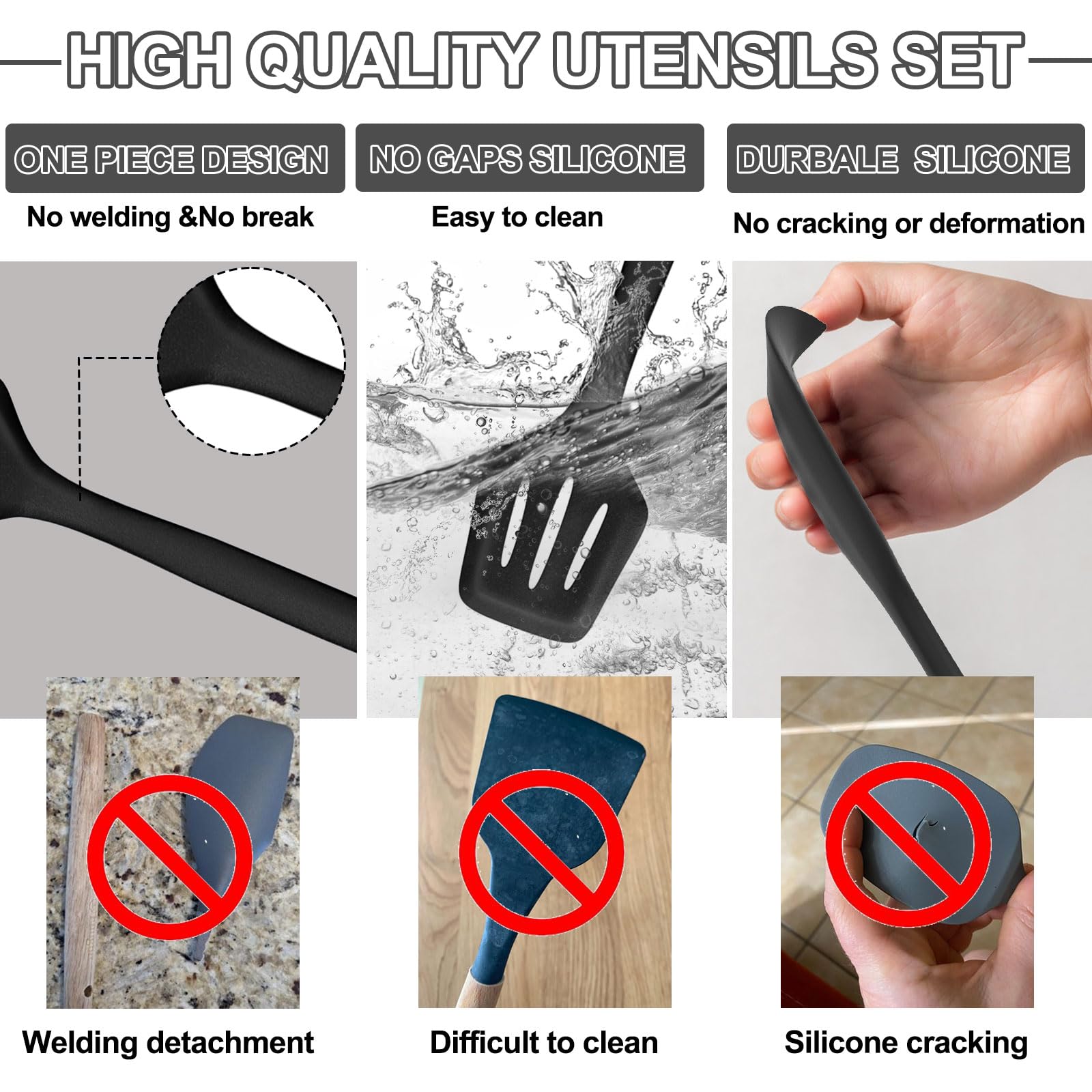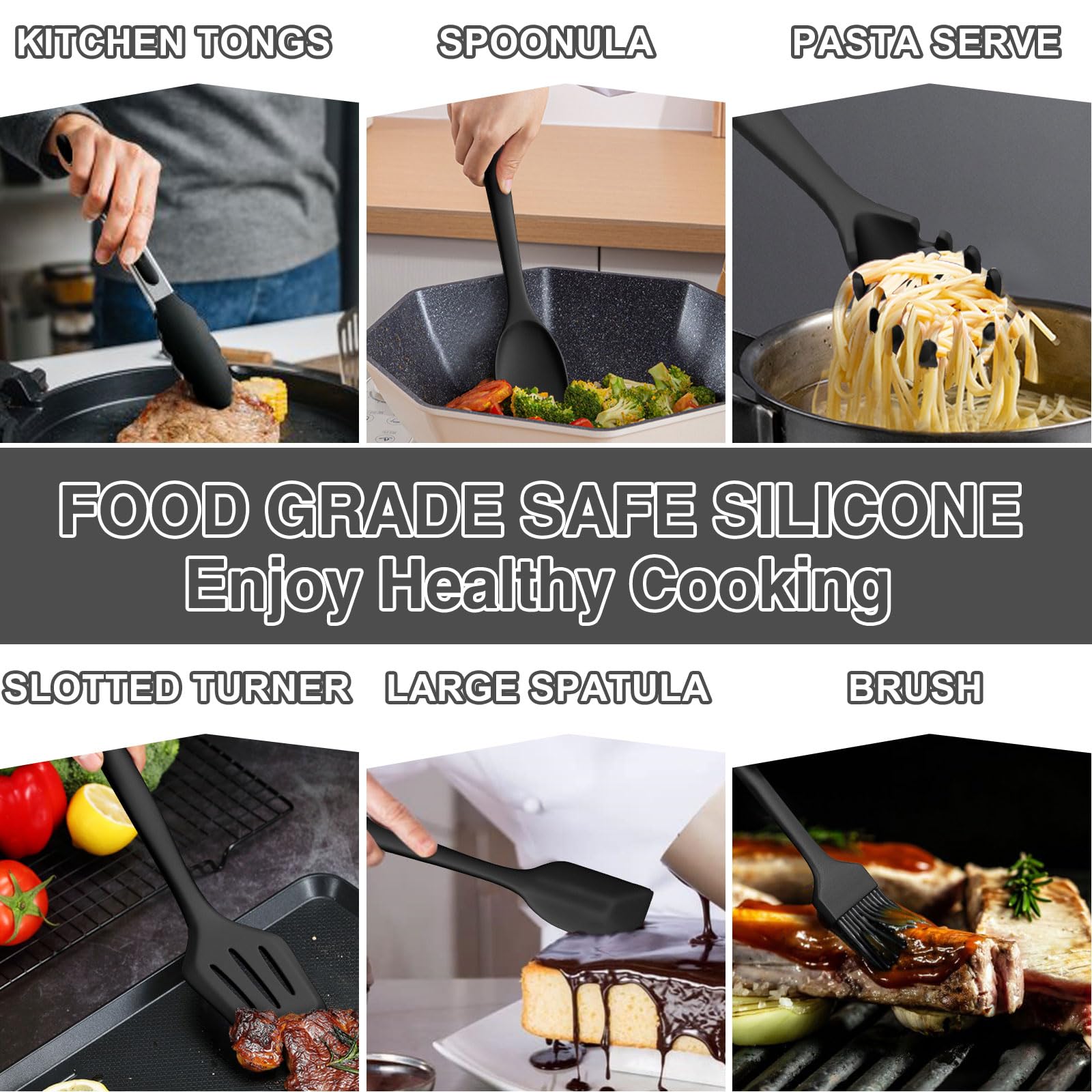 • EASY TO CLEAN &100% DISHWASHER SAFE: Seamless silicone design which is a major plus as there aren't any cracks or ridges to catch food or harbor anything that makes it super easy to clean. The sturdy silicone surface eliminates the worry about damage caused by machine washing to the product, Just put it in the dishwasher after use, and you will get a new set. This cookware utensils set has everything you need, It’s an ideal gift for Mother’s Day, Christmas, as a housewarming present and more.