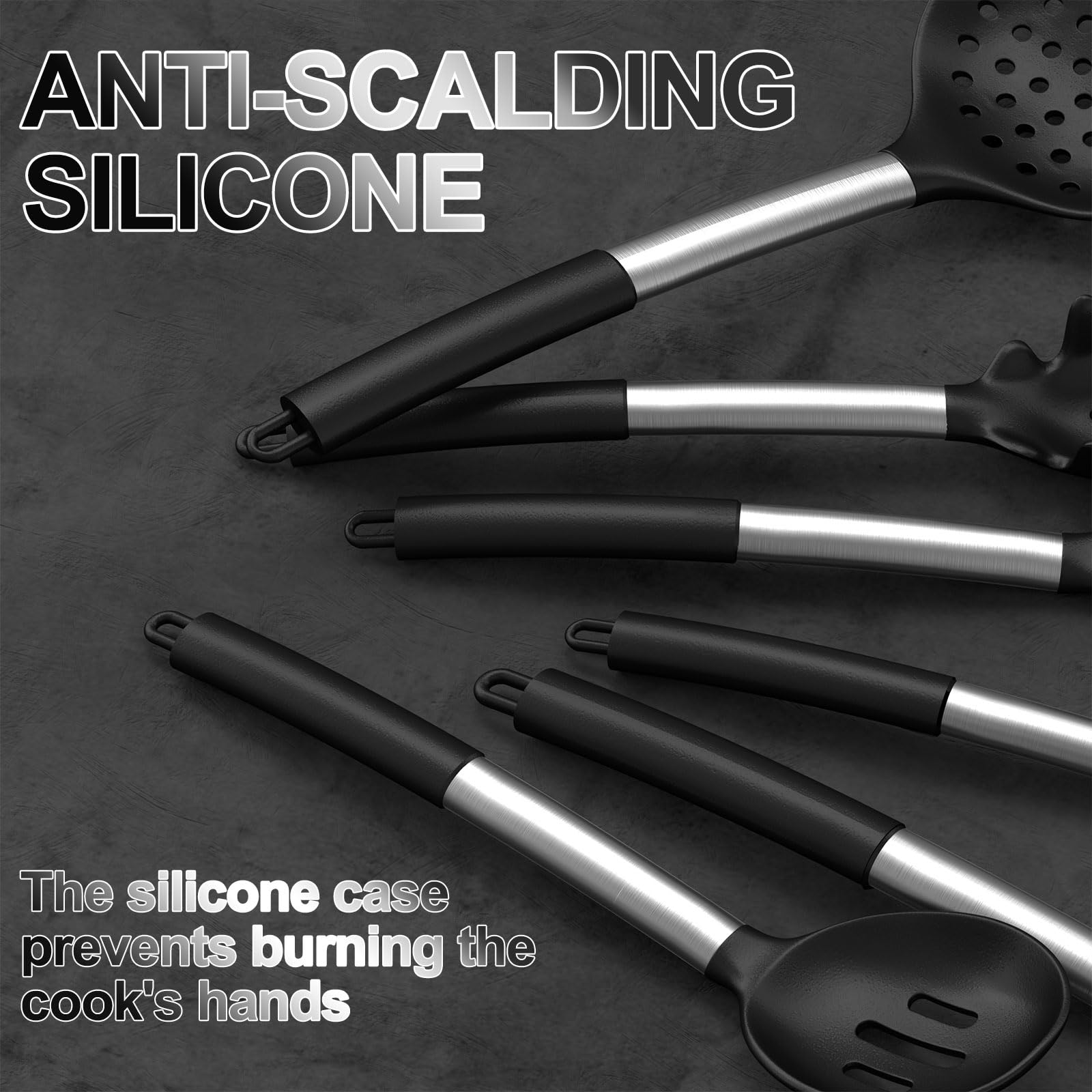 • LARGE KITCHEN UTENSILS WITH STAINLESS HANDLE If you've grown tired of small kitchenware that resembles children's toys, this large kitchen tools set is perfect for you. The silicone head combined with the high-quality stainless steel handle ensures lightweight and durable for everyday use. The container is big enough to fit everything back in easily. Stainless steel handles are not only corrosive-proof but also do not need to worry about fading or wear