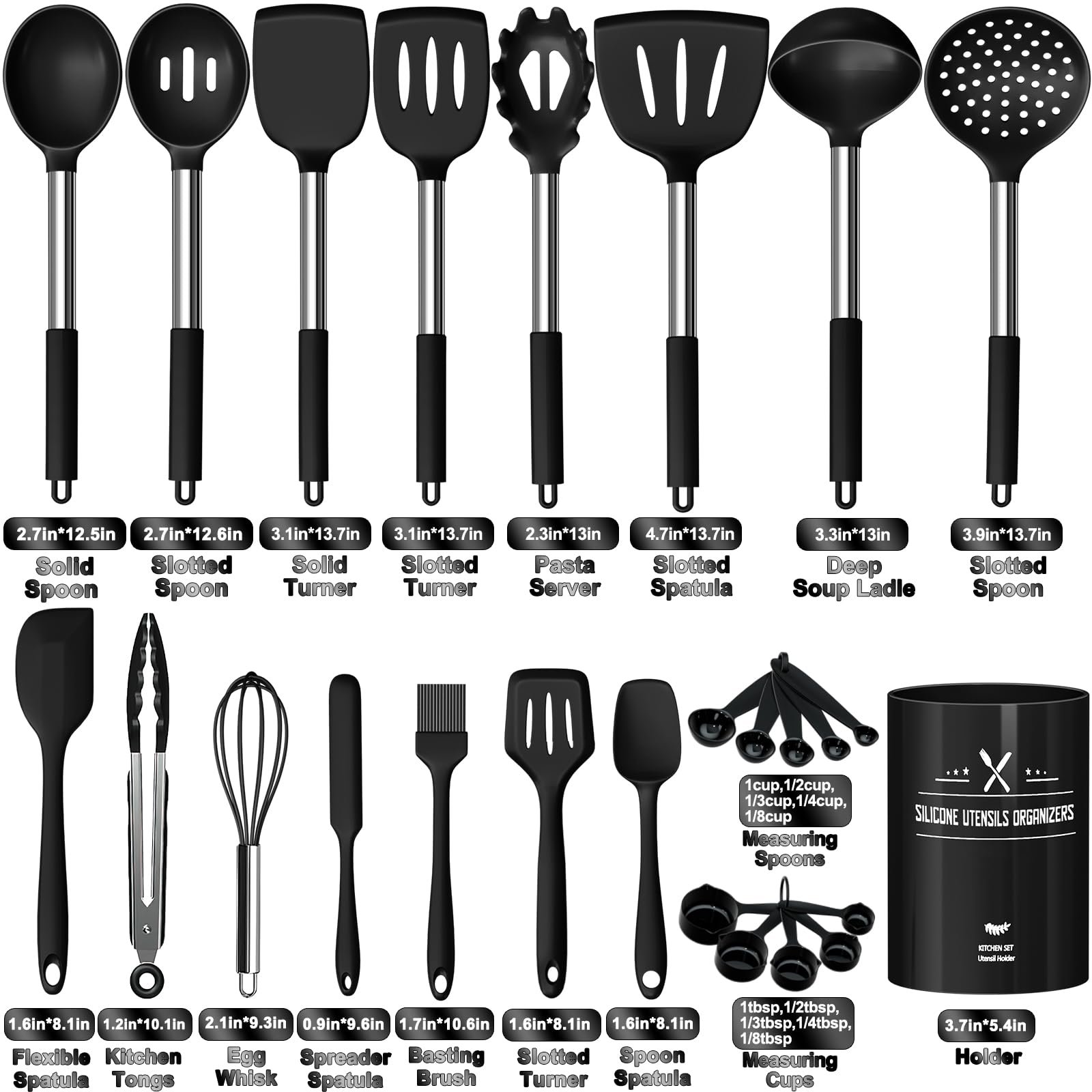 Silicone Kitchen Utensils Set, Umite Chef Large Heat Resistant Cooking Utensil, 26Pcs Silicone Spatulas Set, Stainless Steel Handle, Black Kitchen Gadgets Tools Set for Nonstick Cookware