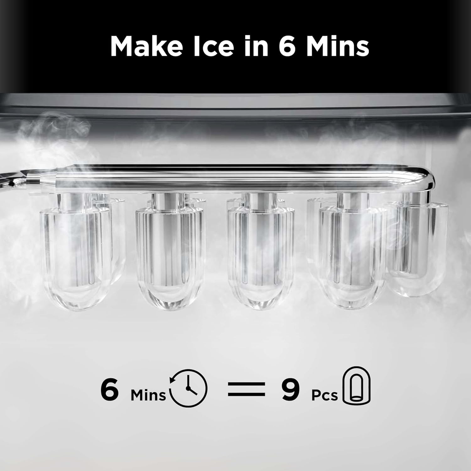 • FAST ICE MAKER: The Silonn ice maker only takes 6 minutes to make 9 bullet-shaped ice cubes. Fill 2L of water into the water tank, maximum ice capacity can reach 26 pounds in 24 hours