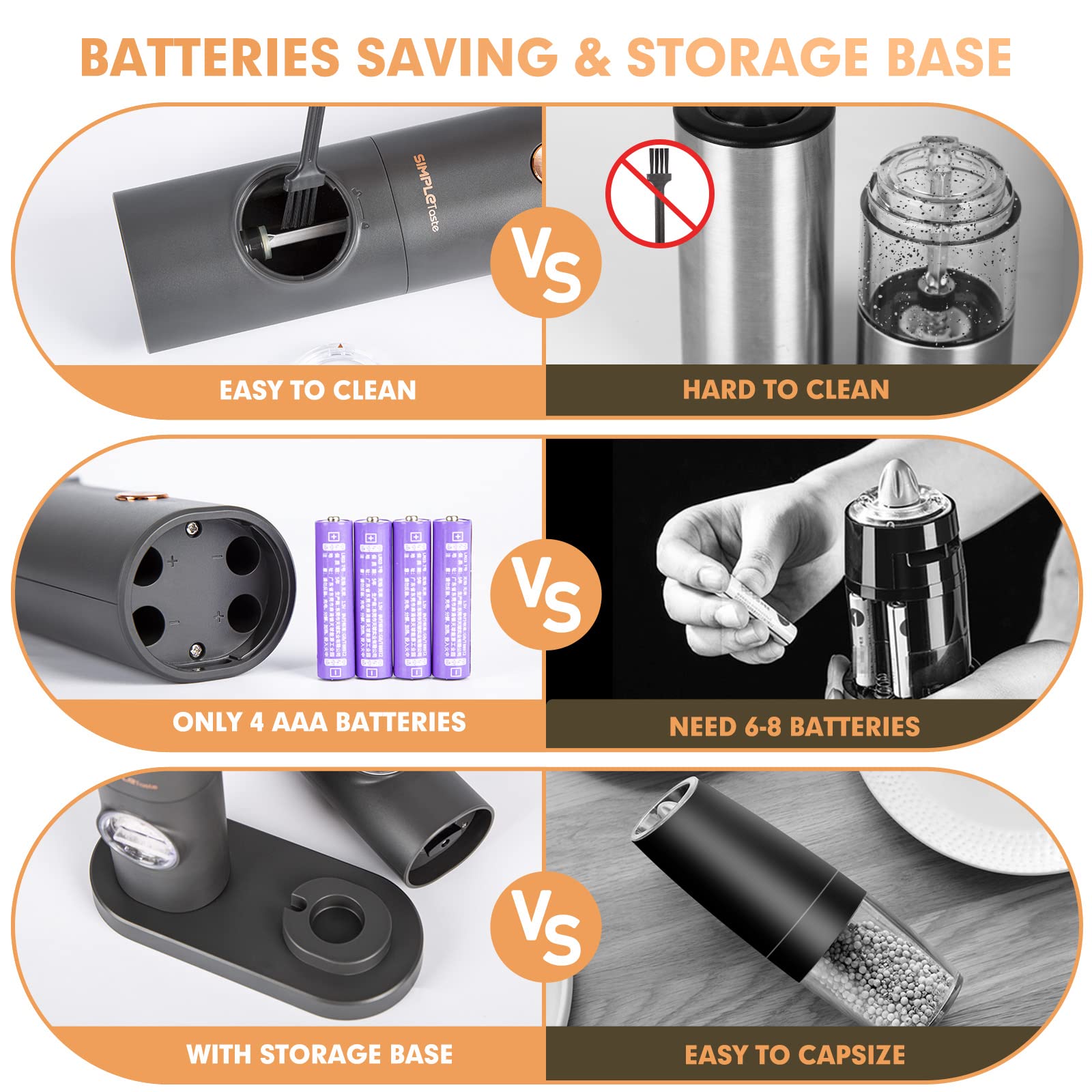 SIMPLETASTE Electric Salt and Pepper Grinder Set, One-Handed, Battery Powered, Adjustable Coarseness, LED Light, Pepper mills with stand, Seasoning Tools for Kitchen, Dining or Gifting