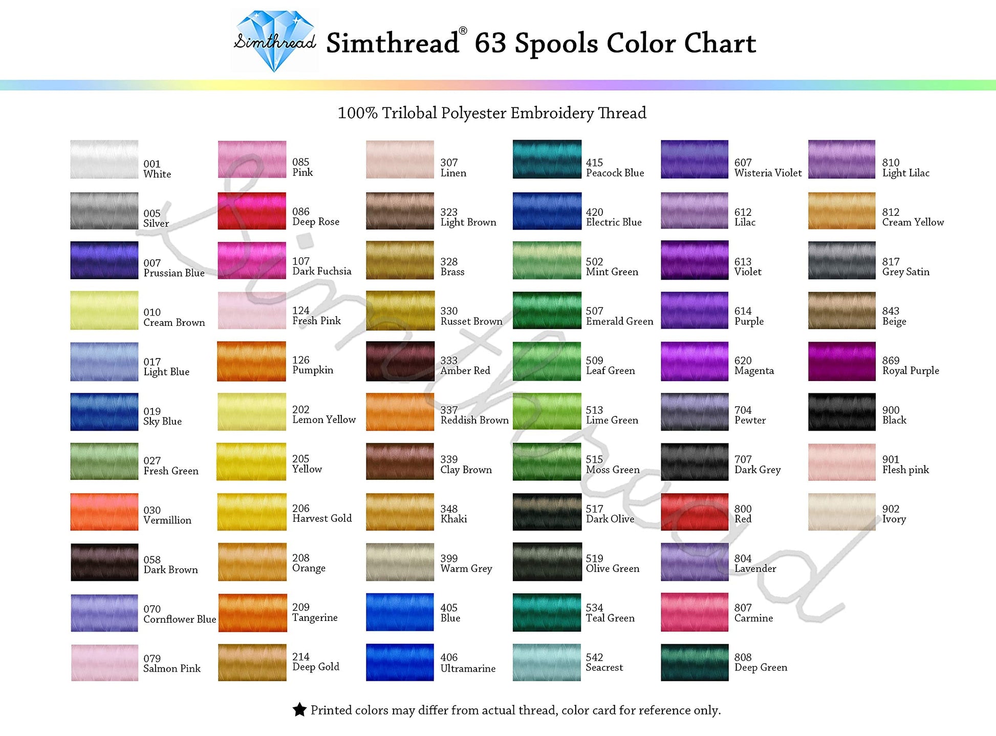 • ✔ 63COLORS PER KIT + COLOR CHART - 63 spools great price variety of colors Polyester Embroidery Machine Thread brighten your Embroidery and Sewing projects. All spools are labeled with the matching brother color number. Include a Color Chart to match up with your design files, conversion Chart of famous brands like Madeira is also available.