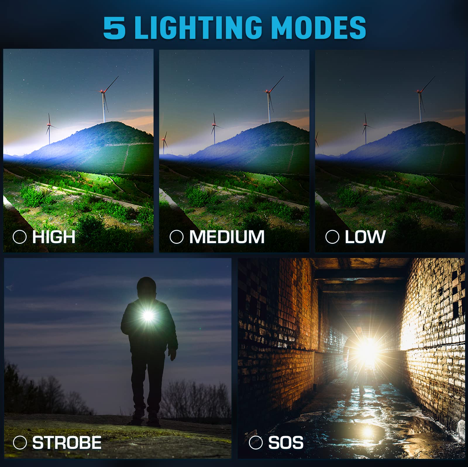 • 【5 Lighting Modes & Telescopic Zoom】Sinvimes Tactical flashlight has High, Medium, Low, Strobe and SOS lighting modes, you can choose the appropriate lighting mode according to your needs. Flashlights high lumens zoom in mode can illuminate half a mountain, and the zoom out mode can illuminate 3280 feet distance. This flash lights can provide super brightness in both outdoor and indoor, giving you a full sense of security, which is ideal for home, hiking, camping, emergencies and more