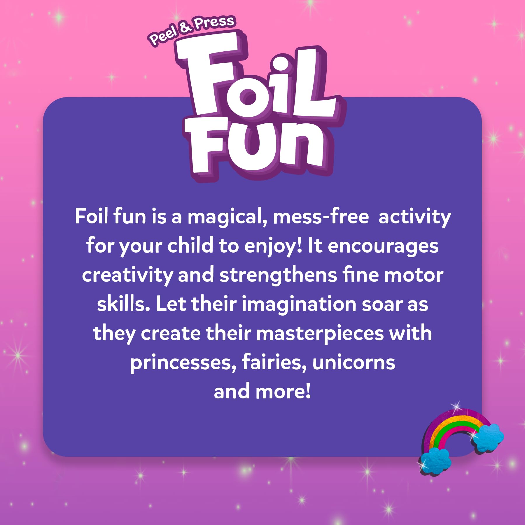 • FOIL ART & CRAFT ACTIVITY: Let your child's imagination soar with this magical, mess-free foil art and craft activity. They can create stunning pictures featuring princesses, fairies, and unicorns, sparking hours of creative play!
