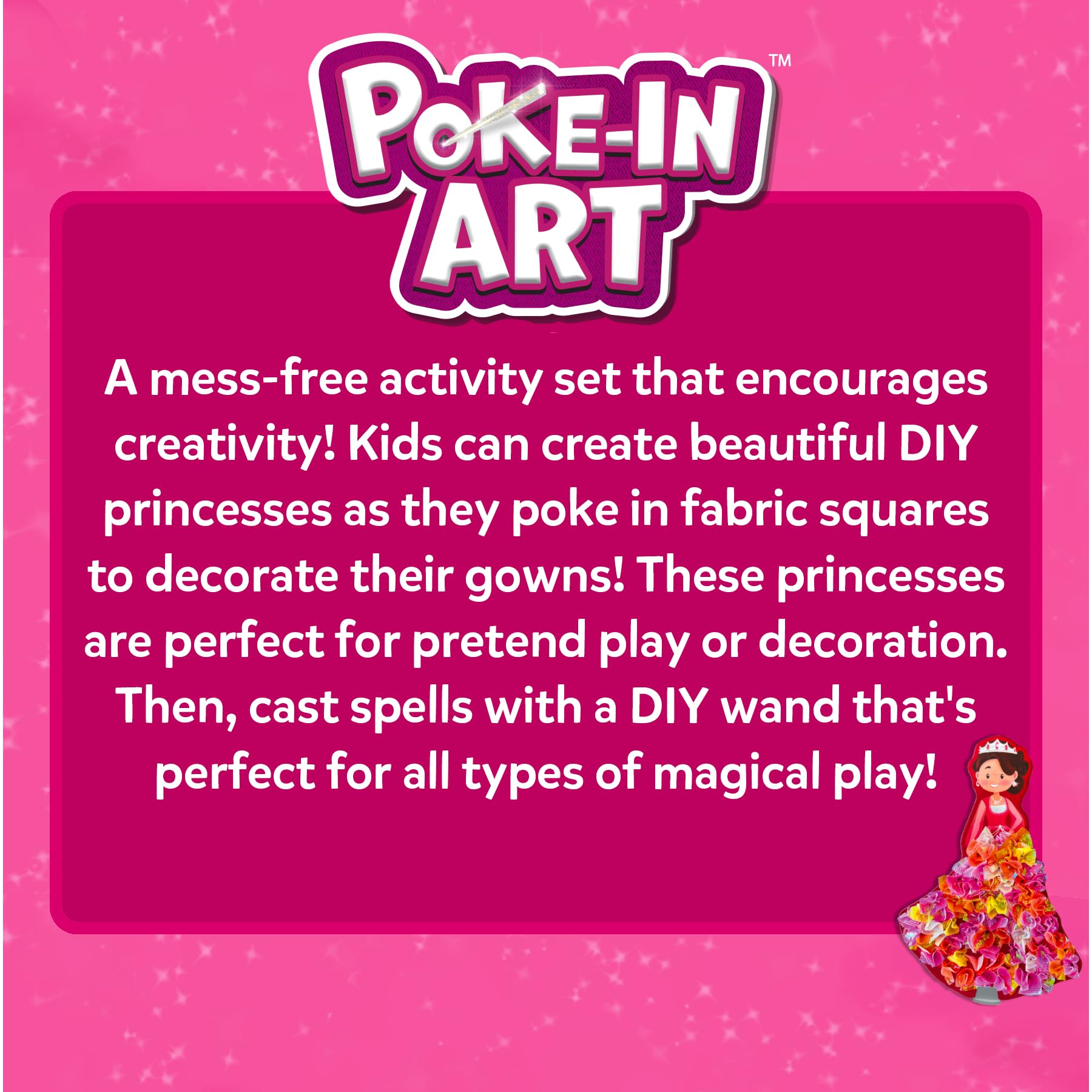 • POKE-IN ART ACTIVITY: This mess-free craft activity encourages creativity! Kids can create beautiful DIY princesses using fabric squares that are poked into foam to decorate their gowns. Then, they can craft their very own DIY wand and cast spells for all types of magical play!