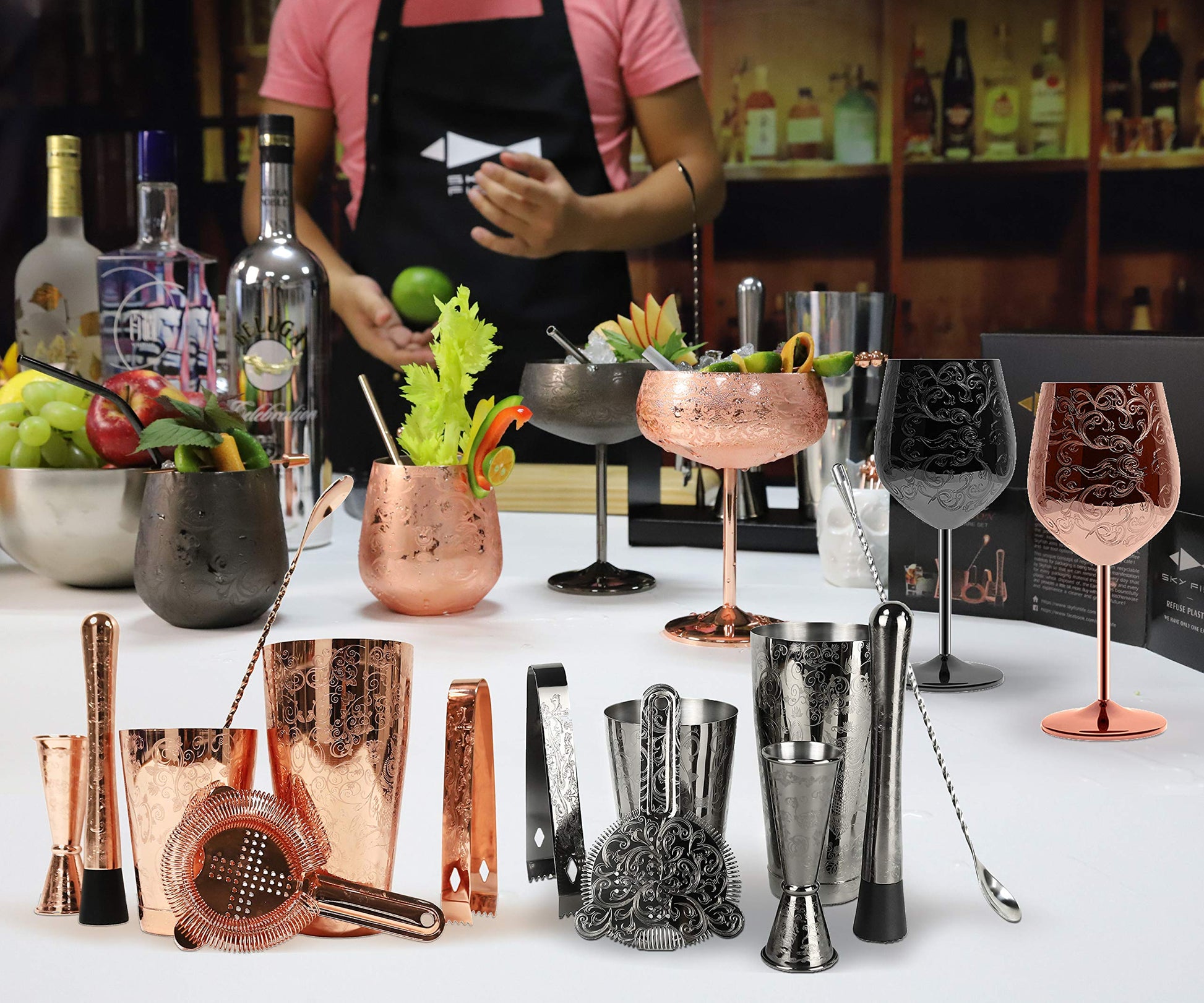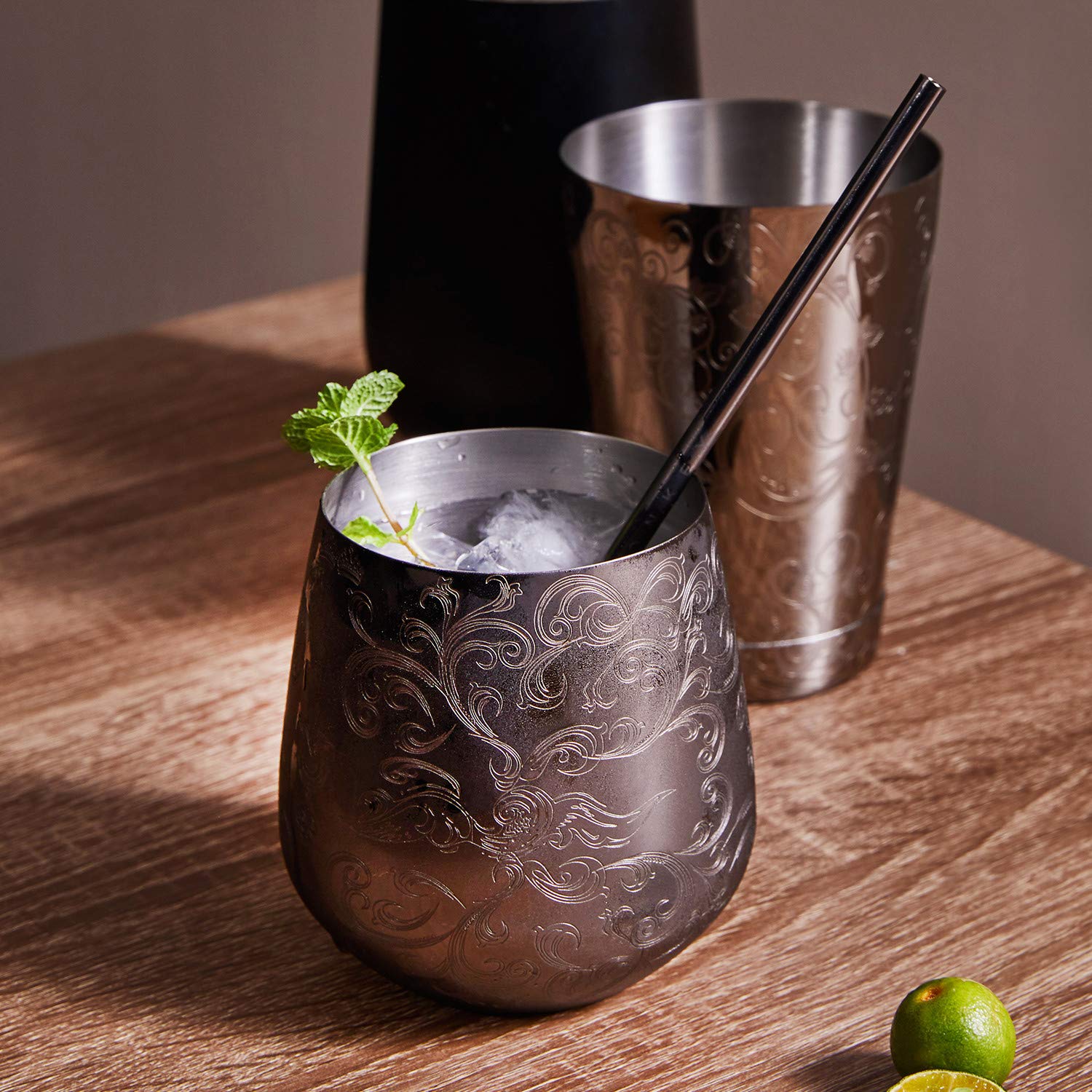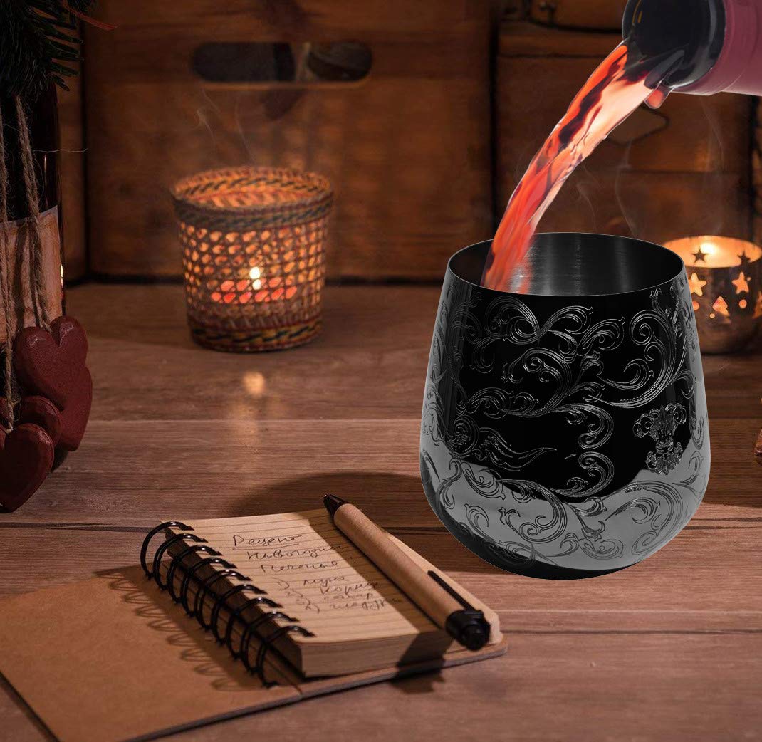 • The elegance of the cocktail glasses and its premium quality stainless steel just shines out with perfect grace and will add royalty to your kitchen. It has the classic delicate engravings from ancient times. Only a stemless wine glasses like this can match the nobility and stature. The black colored wine cups will make you feel like a Knight of the middle age.
