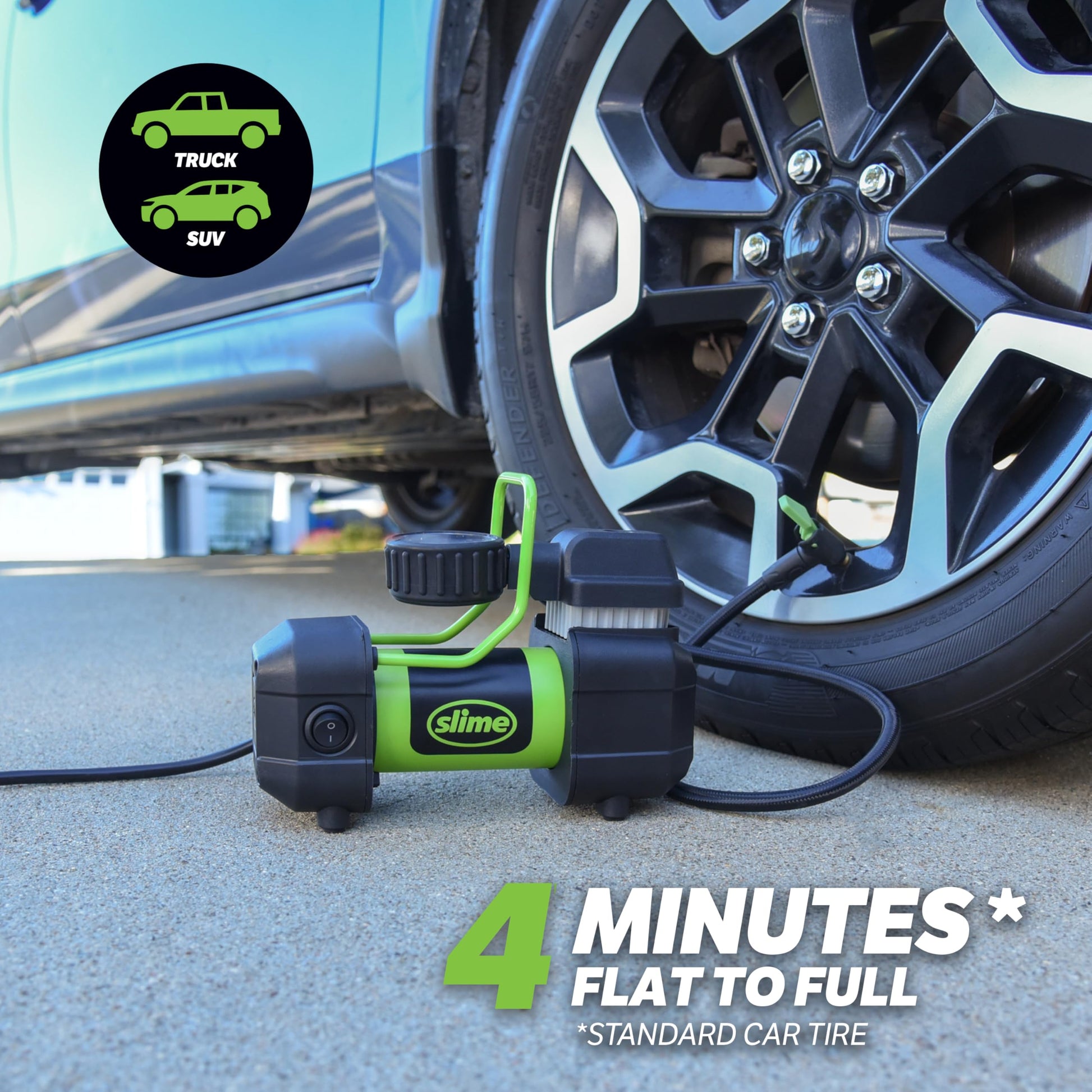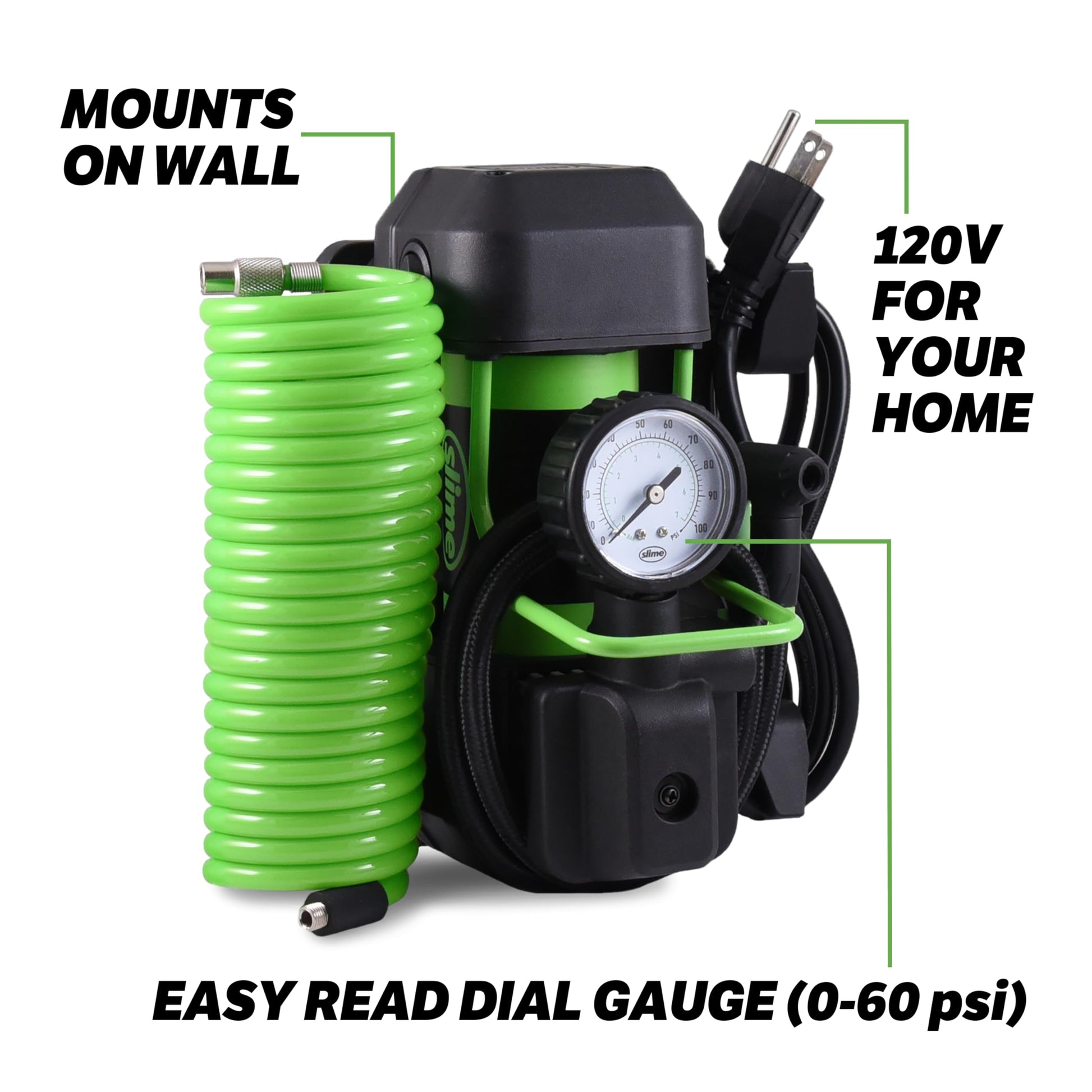 Slime 40045 Home Tire Inflator, Wall Mounted 120V, SUV, 4x4 Air Compressor, Heavy Duty, 2X Pro Power, with Analog 100 psi Dial Gauge, Long Hose and LED Light, 4 min Inflation