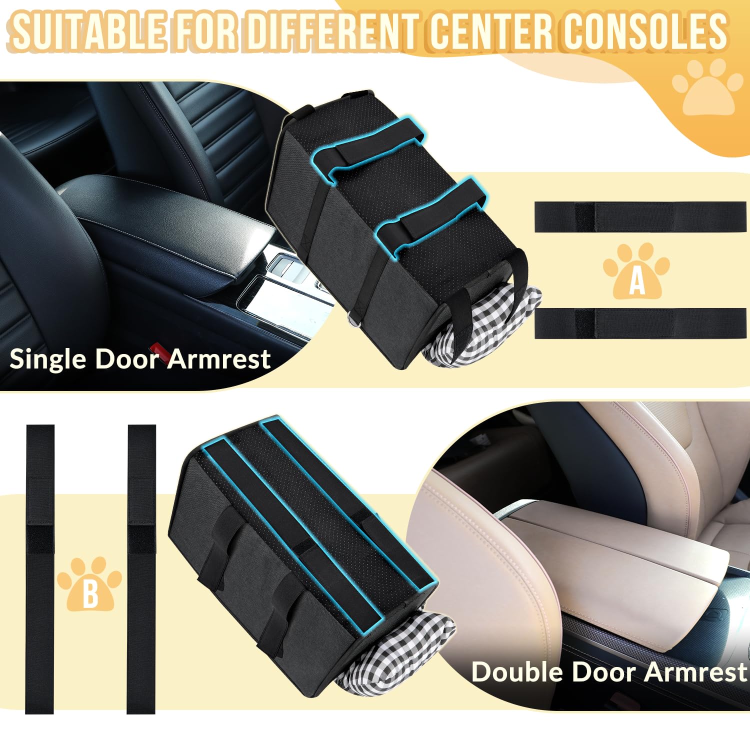 • ๐’๐ฎ๐ข๐ญ๐š๐›๐ฅ๐ž ๐Ÿ๐จ๐ซ ๐ƒ๐ข๐Ÿ๐Ÿ๐ž๐ซ๐ž๐ง๐ญ ๐‚๐ž๐ง๐ญ๐ž๐ซ ๐‚๐จ๐ง๐ฌ๐จ๐ฅ๐ž๐ฌ --- The pet car seat's bottom straps can be attached horizontally or vertically to accommodate different car models. The elastic bottom straps secure the bag to the center console, and the doggie car seat also comes with an adjustable safety belt that connects to your dog's chest or back strap for added security