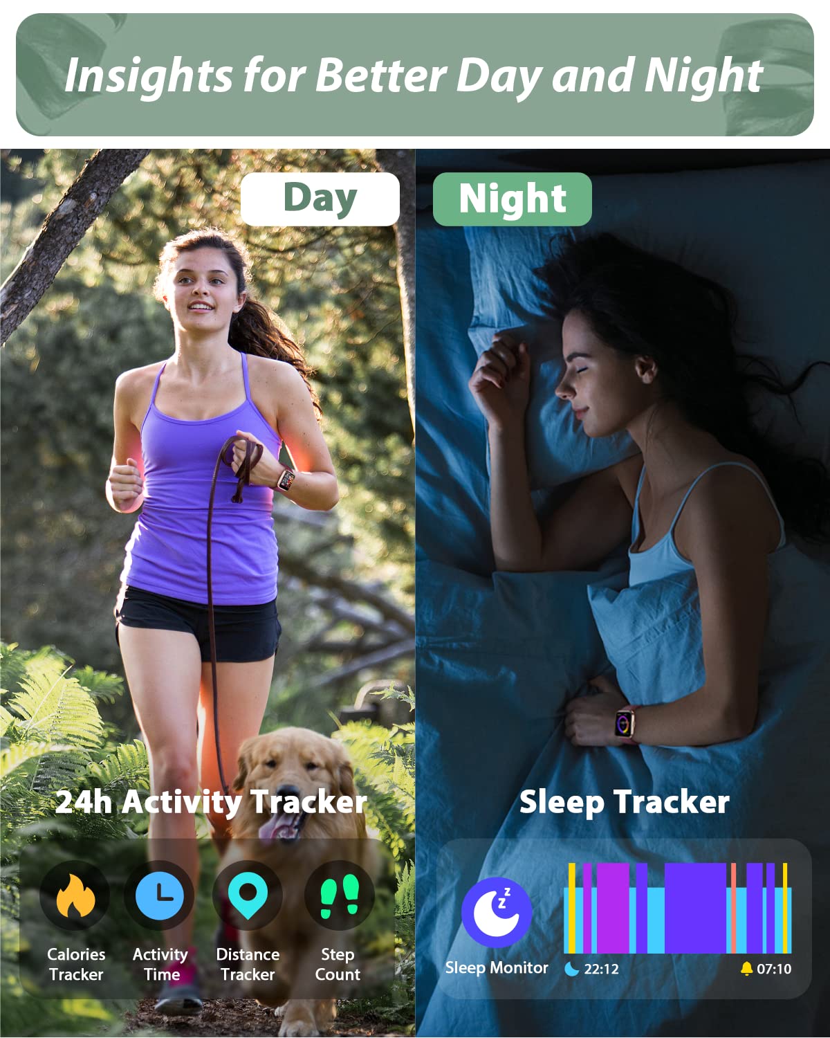 • 【24/7 Accurate Health Monitoring】Smart watch for android phones with advanced sensors provide insights to help you better understand your health and make a reasonable adjustment on your lifestyle. Keep an eye on your health metrics (heart rate, blood oxygen, sleep and stress level), as well as recording female menstrual period. And it will monitor your sleep status automatically and provides comprehensive sleep quality analysis (deep sleep, light sleep and awake), better sleep starts here.