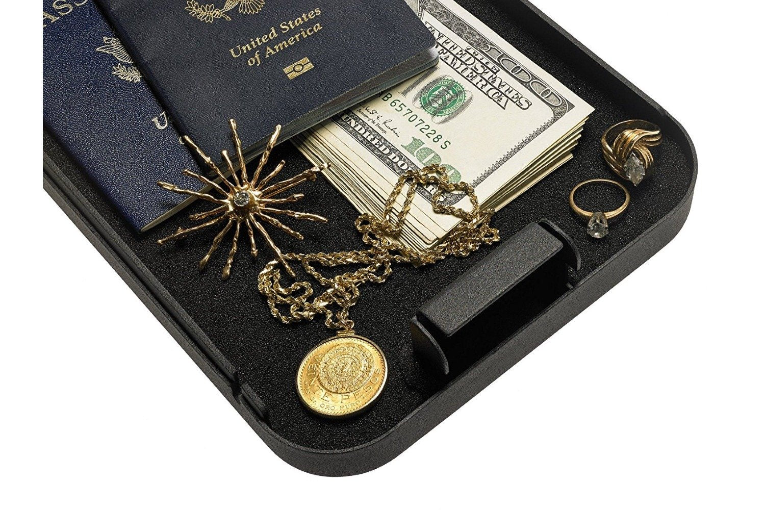 • Install Anywhere – It easily fits in a suitcase or under a car seat as a car safe. The foam interior protects your valuable contents. Makes a perfect camping lock box, gun safe for bedside, dorm room lock box, vehicle gun safe,