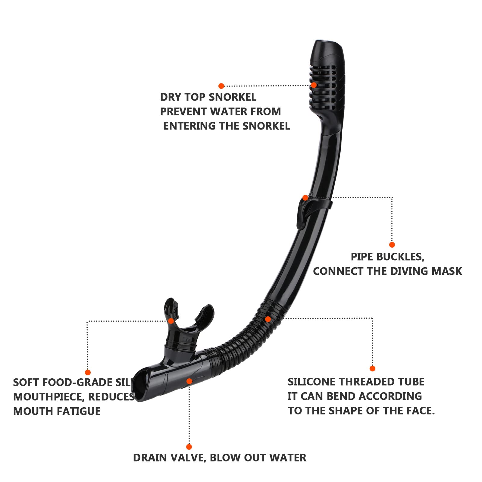 • ●Safe snorkel :The new dry vent pipe uses an automatic closing valve at the opening to prevent water from entering. When the snorkel enters the water, the opening at the top of the snorkel automatically closes and reopens when the snorkel reaches the water surface. Even if the waves hit overhead, the splash guard prevents water from entering the snorkel. Unlike floating ball valves that are easily stuck by small sand particles or other objects, our new valve will not be stuck