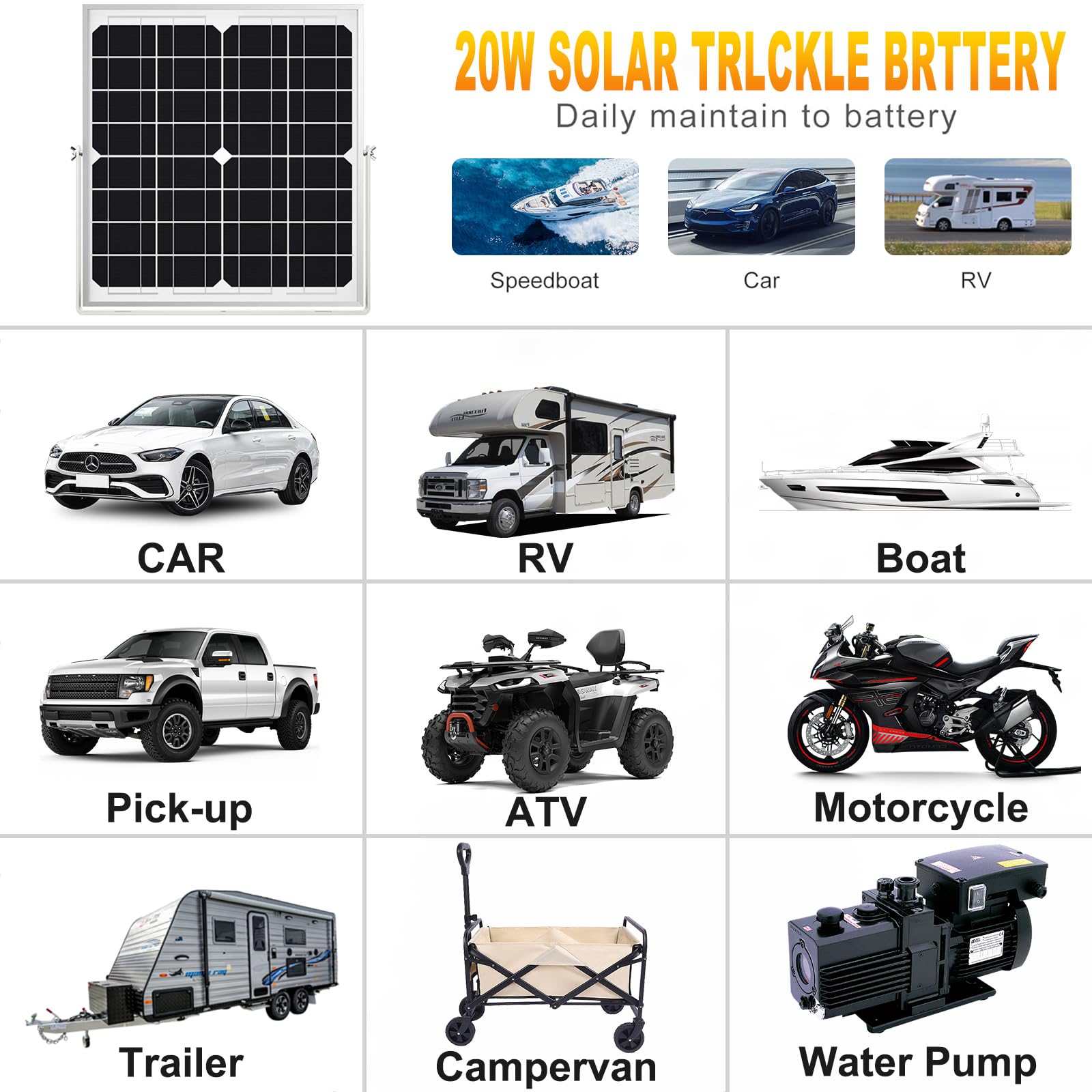 • 【High Conversion Rate】This 20W solar panel with monocrystalline A+ solar cell has an excellent cell efficiency of 21%-30%. Designed to charge and maintain 12V rechargeable batteries like LiFePO₄, Lithium Ion, AGM, SLA, GEL, EFB, MF, etc. Keep batteries in charged for trailer, tractor, truck, boat, motorcycle, RV, car, lawn mower, water pump, gate opener, electric fence, etc