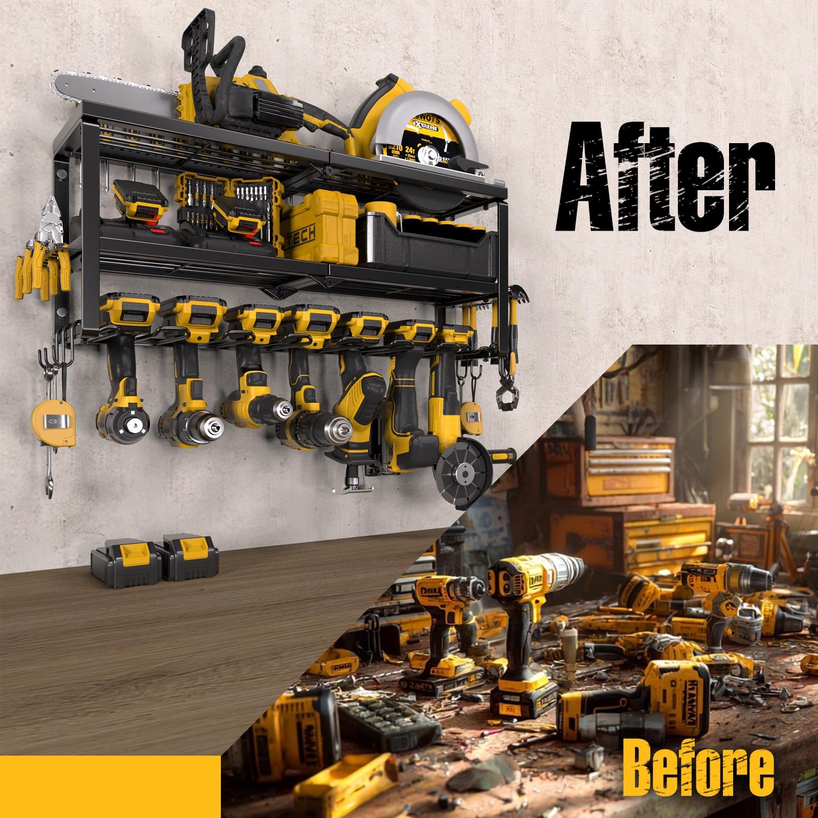 • Store 50+ Kinds of Tools: Our power tool storage rack is suitable for both indoor and outdoor use and compatible with pegboards. You can store your charging stations, batteries, toolboxes, drill bits, hammers, and other garage tools without any extra hassle