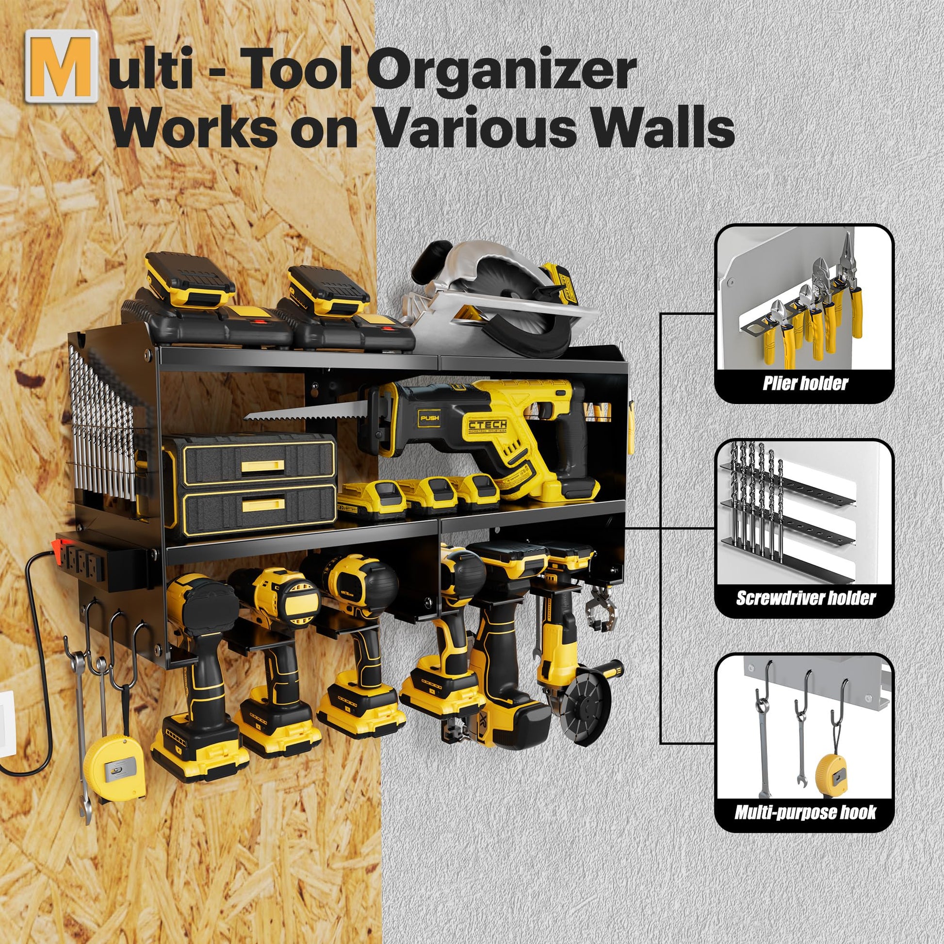 Spampur Power Tool Organizer Wall Mount with Charging Station, 3 Layer Heavy Duty Metal Tool Storage Rack Loads 4200lbs with 6 Cordless Drill Holder, Tool Storage Rack with 4 Outlet Power Strip