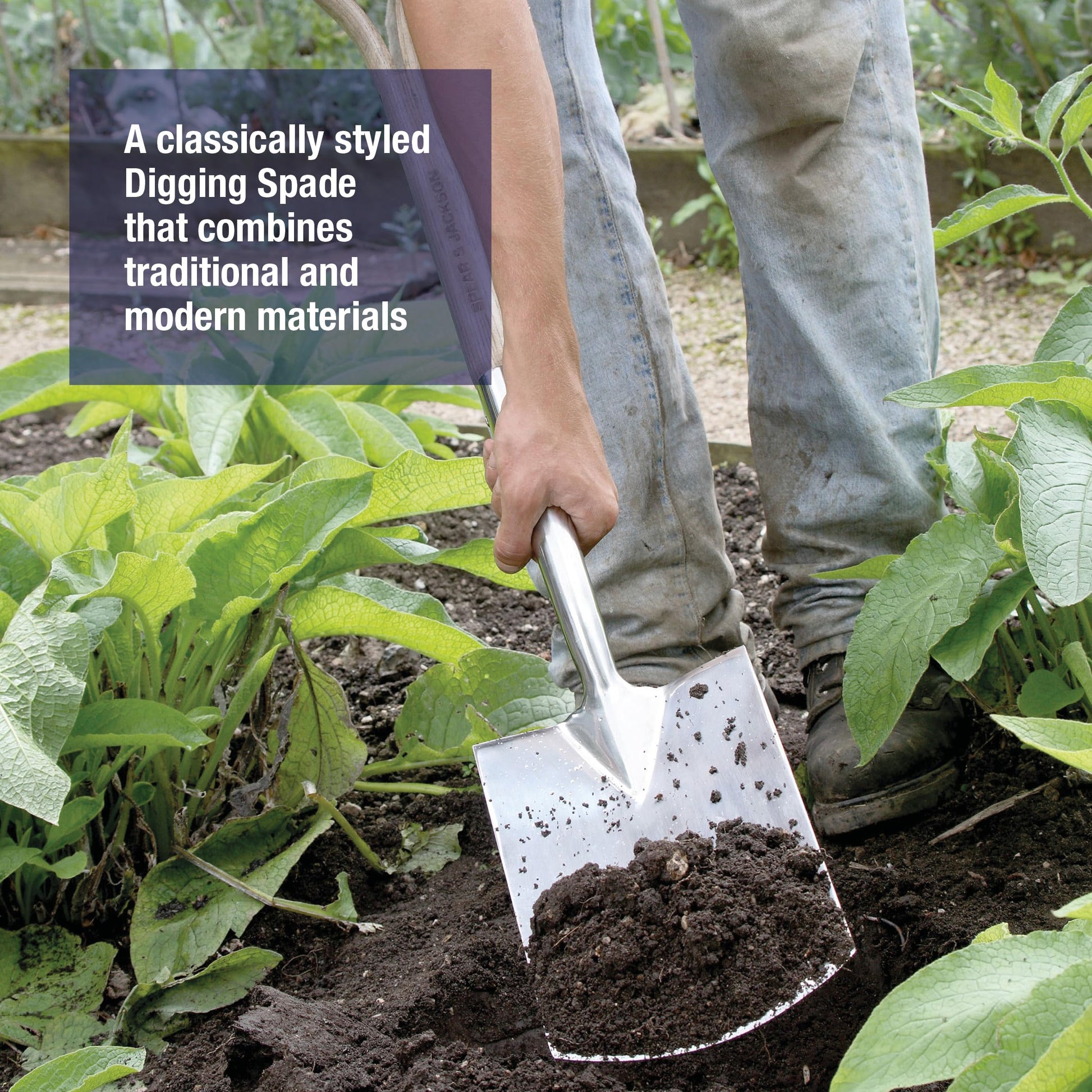 Details: The Spear & Jackson Traditional Digging Spade is a perfect addition to your garden tool collection. The one piece hardwood shaft provides an attractive yet durable finish and is split to form a comfortable and traditional wishbone handle, giving a smooth line from bottom to top. This attractive look is coupled with a weatherproofed finish, so you are safe to use the spade in all weathers. The head is constructed from mirror polished stainless steel which provides greater resistant to rust as well as keeping soil adhesion to a minimum, this helps the blade slip easily into the ground and also makes cleaning easier. This item carries a 10 year guarantee. The Traditional Range of tools from Spear & Jackson have been created by combining our history and tradition with modern materials and manufacturing expertise, resulting in a timeless, attractive and highly functional selection of tools which resemble the tools of yesteryear yet with modern performance and durability. Spear & Jackson are an English company whose roots were laid in 1760. Since their beginnings, centuries of experience and innovation have resulted in the materials and development expertise that resides within the company today. By combining traditional values and materials with modern manufacturing techniques Spear & Jackson established themselves as key players in the British gardening landscape. Over the centuries Spear & Jackson has grown to be a world-wide brand, distributing products throughout the globe. Spear & Jackson products are manufactured to a high quality standard and offer superb service and longevity; guaranteed against defects in manufacturing, subject to normal wear & tear and the provision of reasonable care and maintenance. This does not affect your statutory rights.