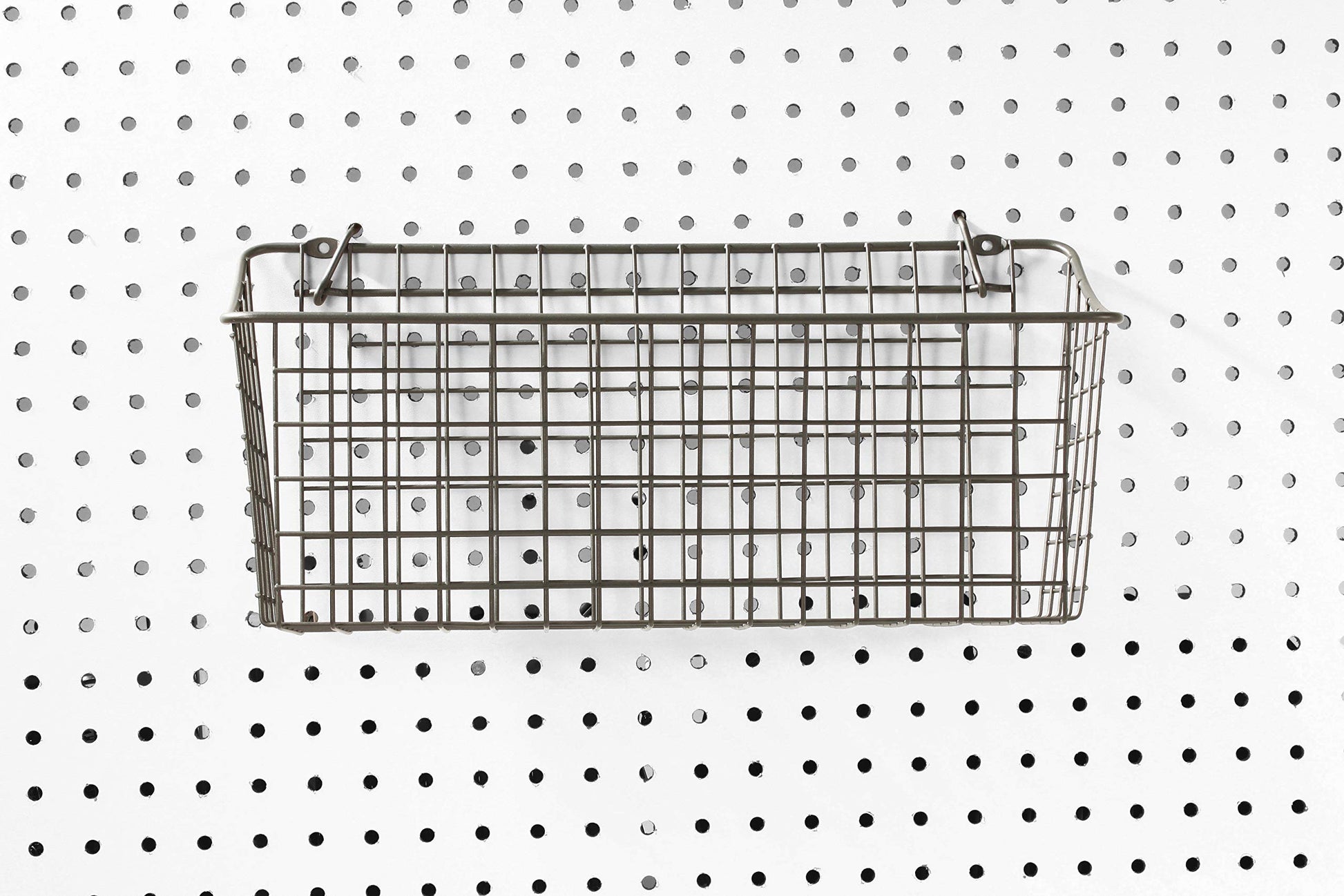 Details: Maximize your wall space with the Extra Large Pegboard & Wall Mount Basket from Spectrum Diversified. Streamline your organization with wall storage. Wire storage basket holds tools, craft supplies, hay for animals and remote controls. Utilize wall space to clear counters, drawers, benches, desks, and shelves. Keep frequently used items organized and easily accessible. Well-designed hooks utilize gravity to hang this organizer from pegboard or slatwall. Created for ¼' pegboard with holes spaced 1' apart, center to center. Comes equipped with optional holes for wall mounting the organizer. Included hardware designed for mounting on wood only; additional hardware and mounting systems may be required for alternative surfaces. Great for kitchen, bath, laundry room, garage, craft room or workshop organization. To install on pegboard or slatwall, simply slide the pegboard hooks into holes on the same level, guide the arms upward, then gently release the tool holder and let gravity do the rest. Ensure tool organizer is level before placing tools inside. Made of sturdy steel.
