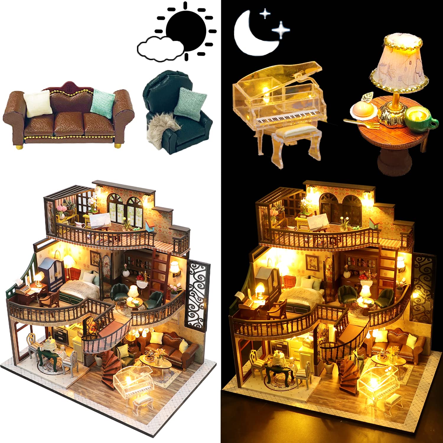 • ♫♫♫【Package Included】Our DIY dollhouse are packed in Colorful Box with all the furniture and accessories in the pictures,also with English Manual,Music box. The music box will make the dollhouse more romantic,Finally, we have a colorful box to make it looks like a perfect gift.