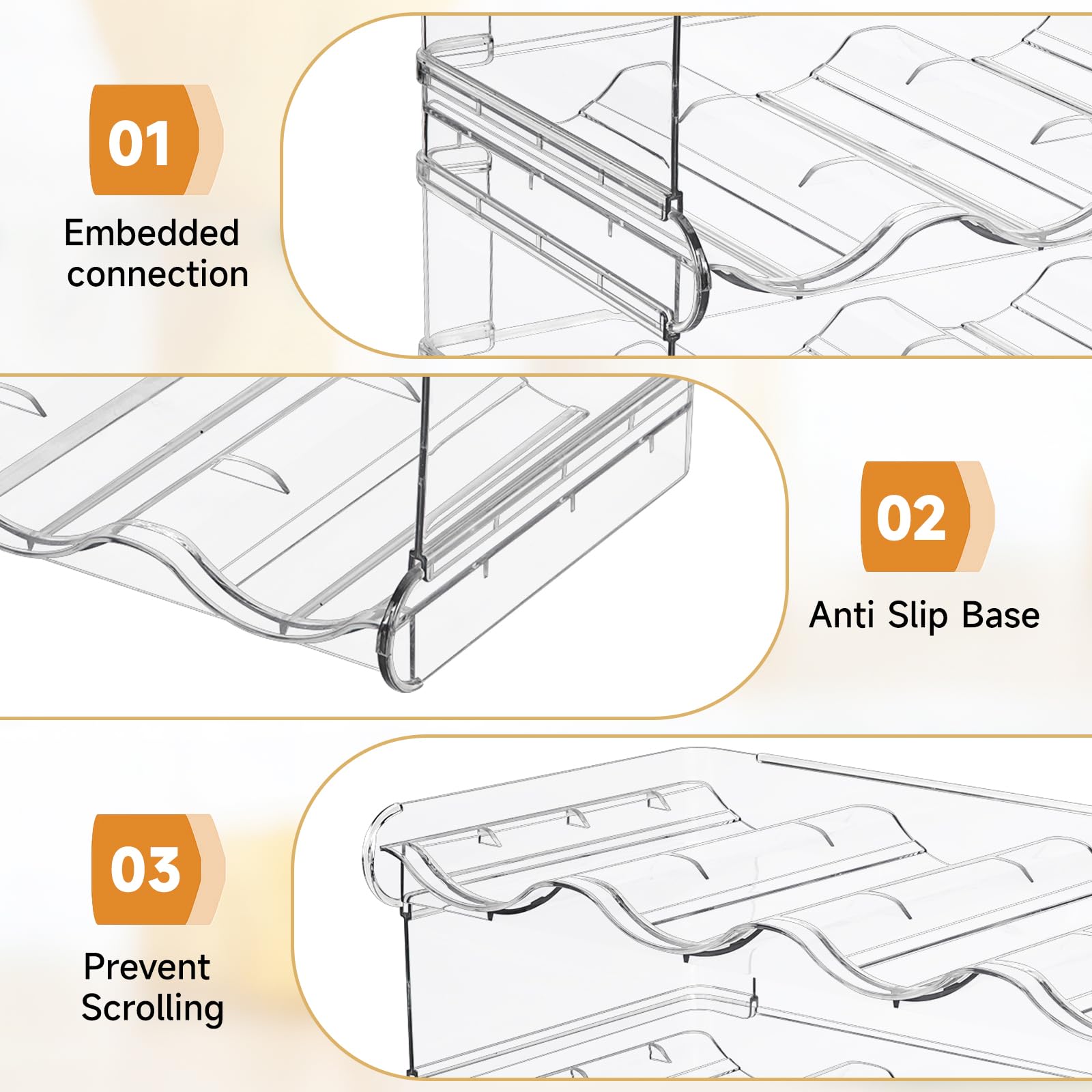 • SPACE SAVING: The 4 Packs water bottle holder can be stacked according to your needs, providing an easy solution for organizing the surplus water bottles in your home. The grooves on the shelf securely hold the bottles in place, preventing them from rolling. It is easy to stack and can be freely split and combined. Installation is simple and requires no tools, with assembly completed in just 1 minute
