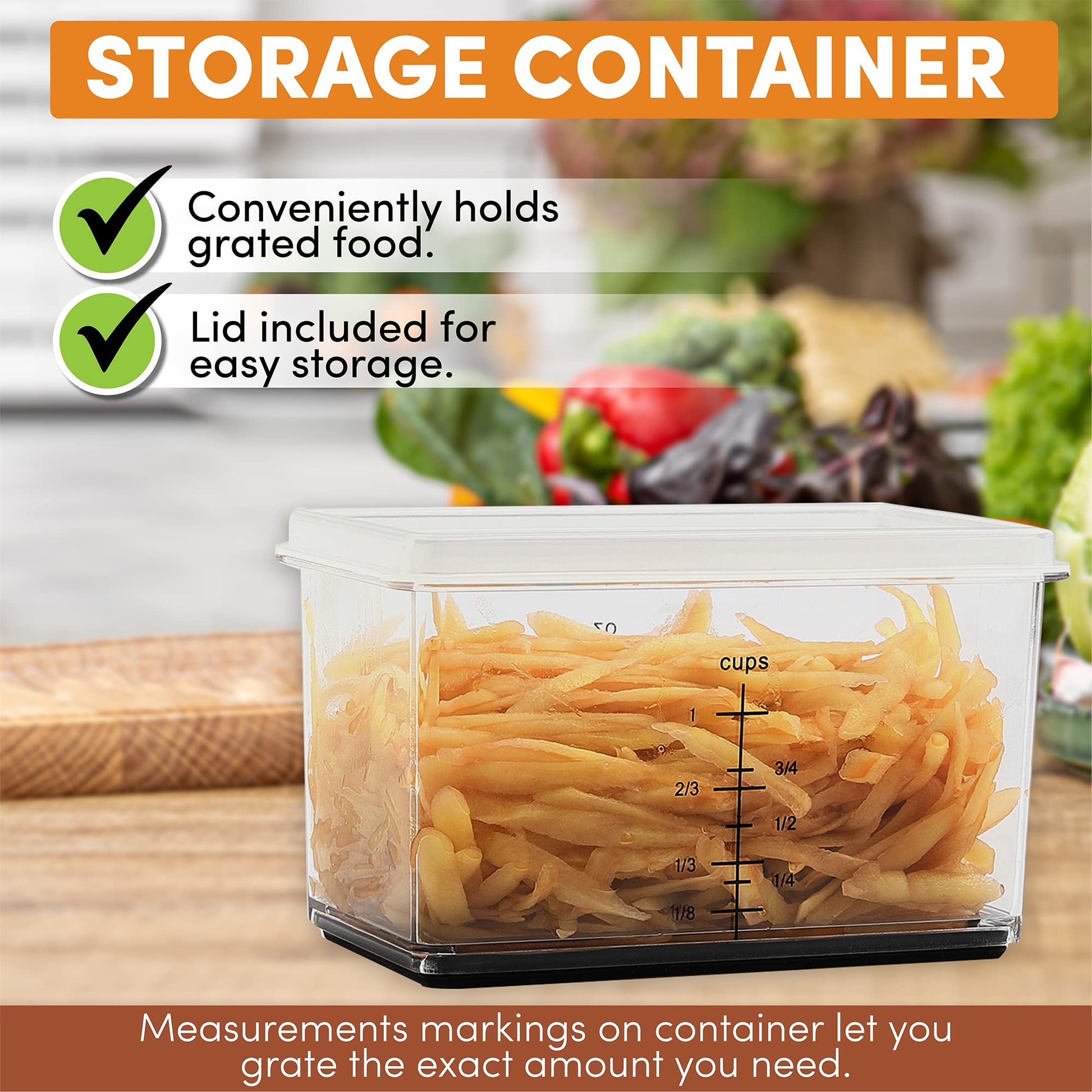 • Included Storage Container With Lid: The included storage box lets you grate directly into the container and store it with the lid. The container also has measurement markings on the side so you can get the perfect amount.