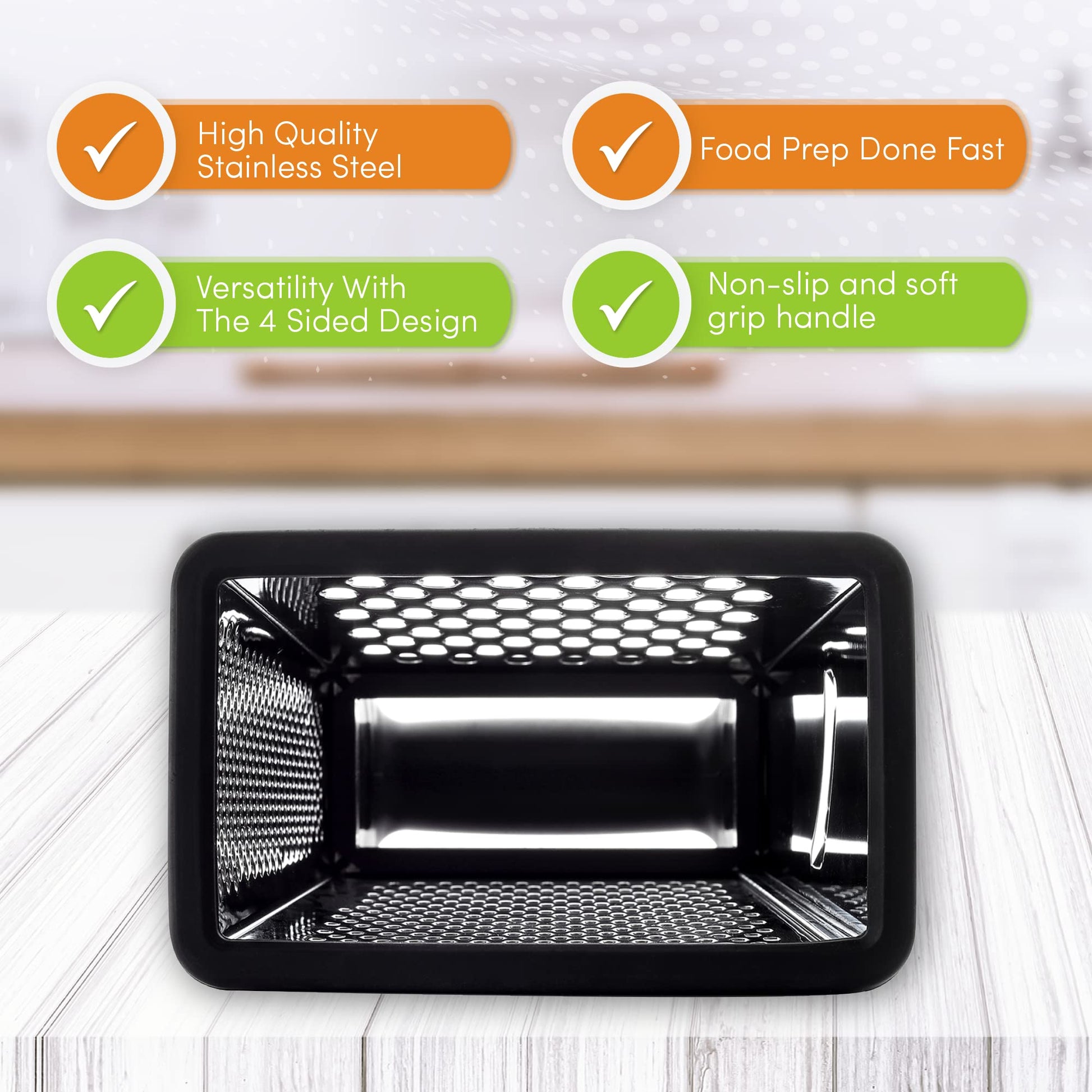• Incredible Versatility With The 4 Sided Design Kitchen Grater: Coarse grating, Medium grating, Fine grating/Zester and even a Slicer - all in one convenient tool. Quickly prep an array of foods like cheese, parmesan, potato, squash, zucchini, carrots, lemons and cucumbers. Multi-functional with a comfortable handle that gives you total control.