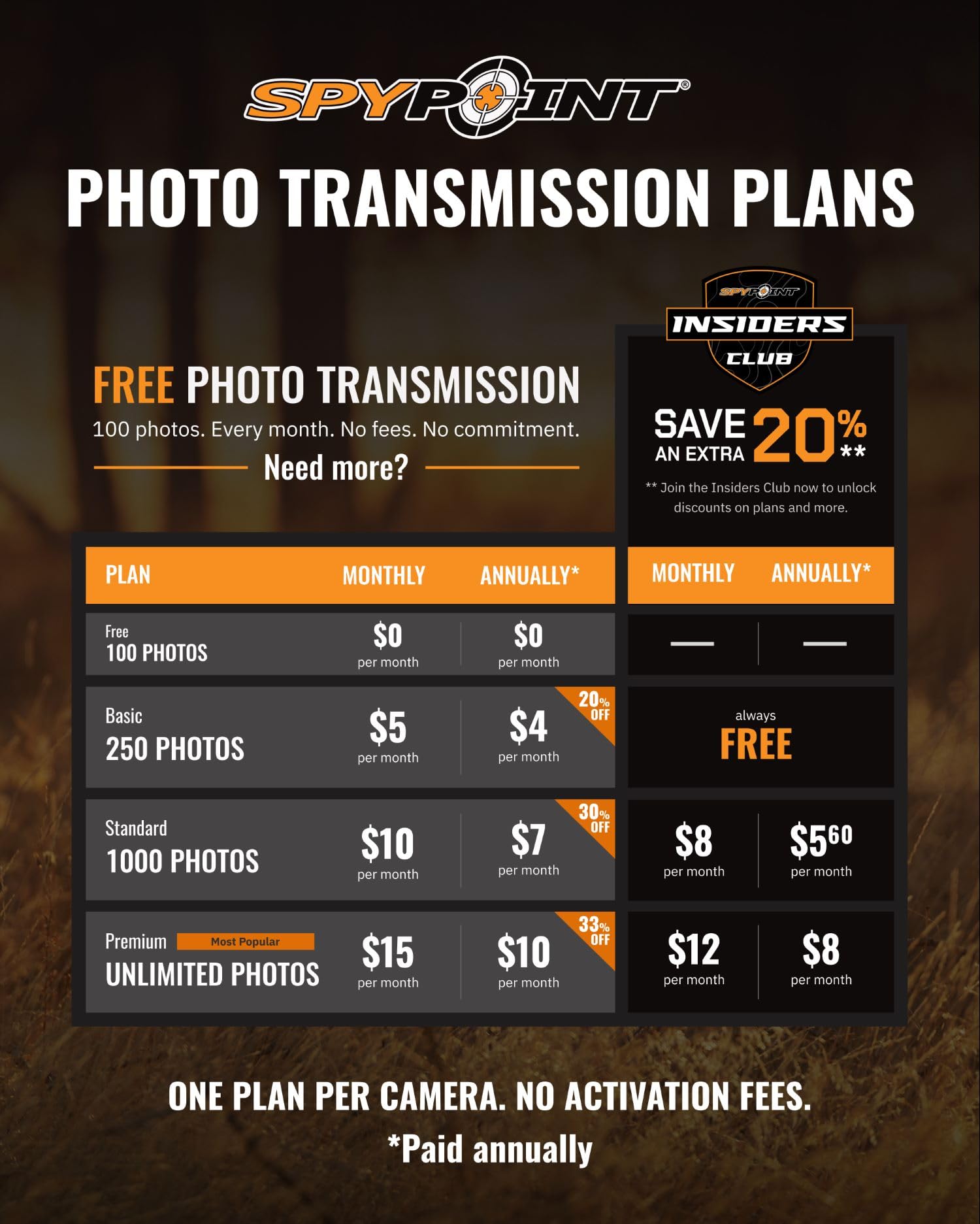 • Enjoy SPYPOINT's FREE PHOTO TRANSMISSION PLAN! Transmit up to 100 photos per month with no fees and no commitment—it's the only free plan for cellular cameras. Need more? Paid plans start at $5/month for 250 photos or $15/month for unlimited. Choose monthly or annual billing with no activation fees. One plan per camera. Plus, join the Insiders Club for extra savings!