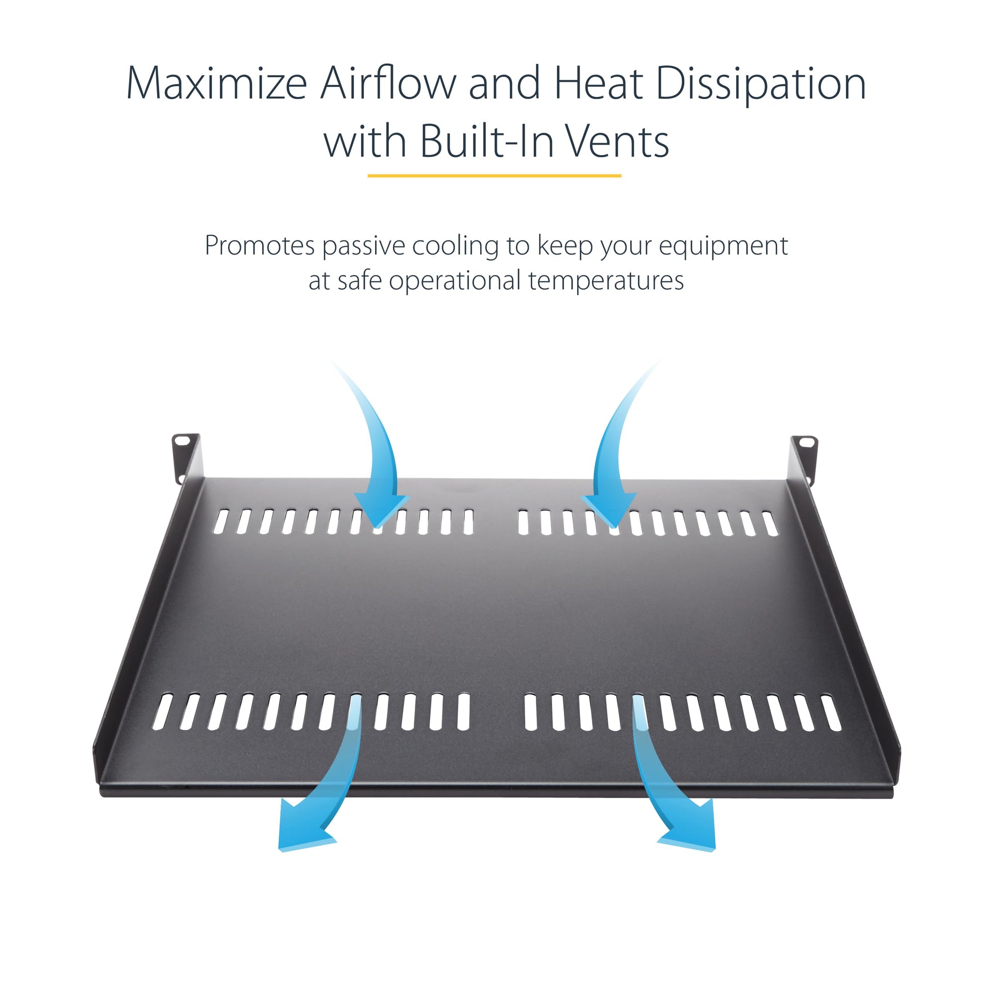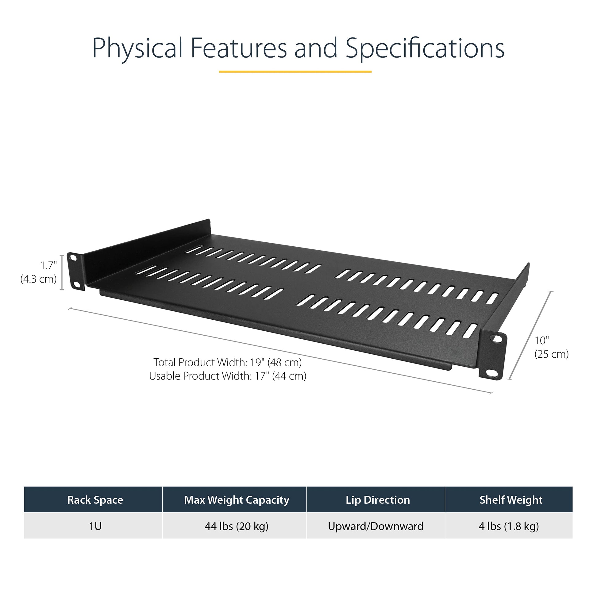 Details: The 1U vented server rack mount shelf is 10in deep and lets you add a compact, 1U shelf to almost any standard 19in EIA-310 compliant server rack or cabinet with front mount options. It’s versatile design ensures it works great for all your computer, AV, network, studio and data equipment needs; perfect for IT and business professional alike. This vented cantilever tray helps to improve air flow and lower temperatures in the rack, ultimately helping to extend the life of your equipment and keep it safe. Constructed using SPCC commercial grade cold-rolled steel, this durable fixed rack shelf can hold up to 44 lbs (20 kilogram) of equipment - a perfect solution for storing small, non rack mount equipment, tools, peripherals or accessories in your rack or cabinet to keep them readily accessible. The rugged steel construction holds up to even the harshest industrial environments, helping to keep your equipment safe. This 1U vented rack tray shelf is backed by a lifetime warranty and free lifetime technical support.