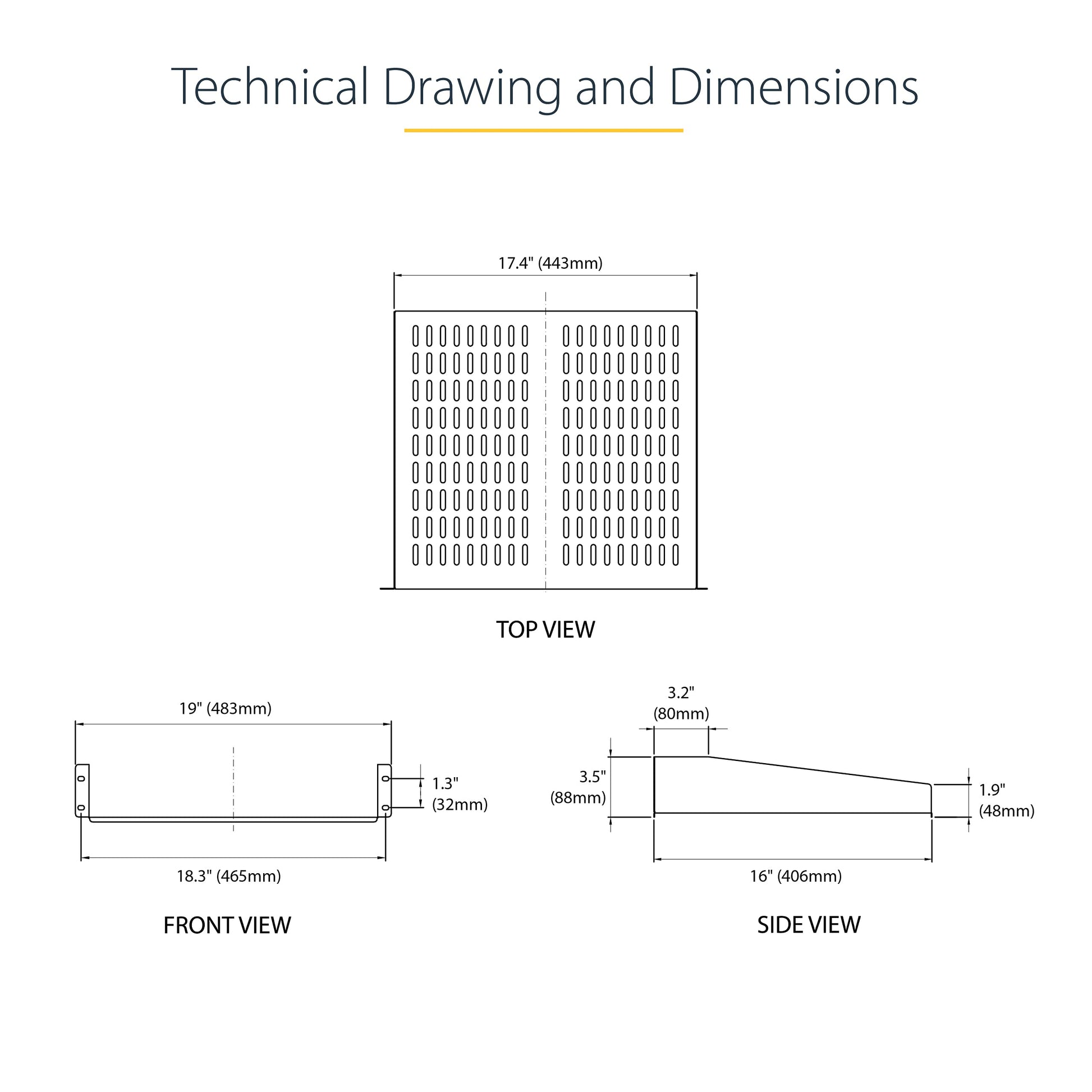 Details: The 2U vented server rack mount shelf is 16-Inch deep and lets you add a compact, 2U shelf for almost any standard 19in server rack or cabinet with front mount options. Its versatile design ensures it works great for all your computer, AV, network and data equipment needs. Added Ventilation this vented cantilever shelf helps to improve air flow and lower temperatures in the rack, ultimately helping to extend the life of your equipment and keep it safe. Heavy-duty Construction Constructed using SPCC commercial grade cold-rolled steel, this durable fixed rack shelf can hold up to 50 lbs (22 kilogram) of equipment - a perfect solution for storing small, non-rack mount equipment, tools, peripherals or accessories in your rack or cabinet to keep them readily accessible. The rugged steel construction holds up to even the harshest industrial environments, helping to keep your equipment safe. Industry Compliant This universal studio rack shelf is a TAA compliant product and adheres to the requirements of the US Federal Trade Agreements Act (TAA), allowing government GSA Schedule purchases. This 2U vented rack tray shelf is backed by a lifetime warranty and free lifetime technical support.