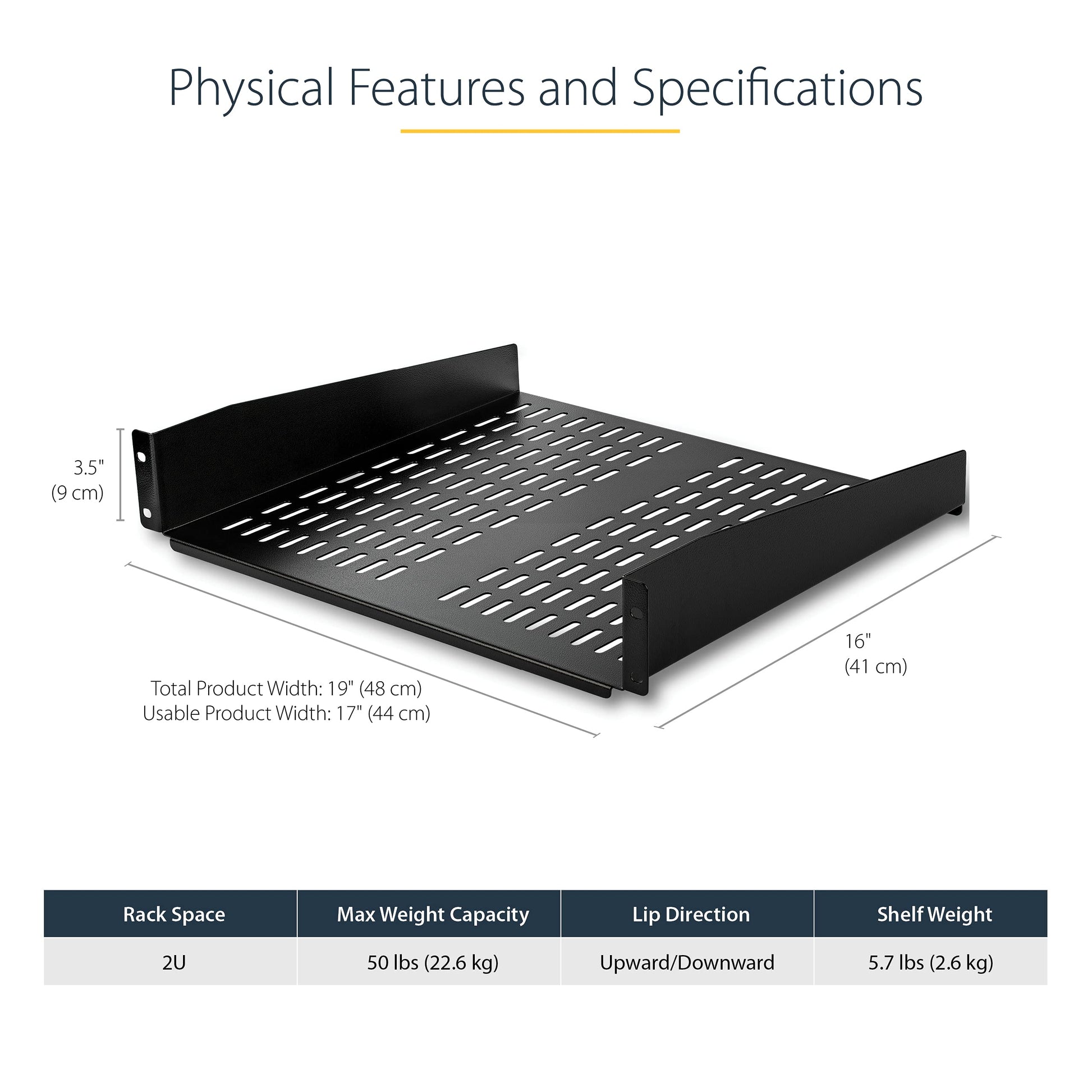 • UNIVERSAL 19'' FIT: This 2U vented server rack mount shelf is designed to fit virtually any 19in server rack and can accommodate an internal depth of 16in (41cm) for your data, IT, networking, or other non-rack mount equipment