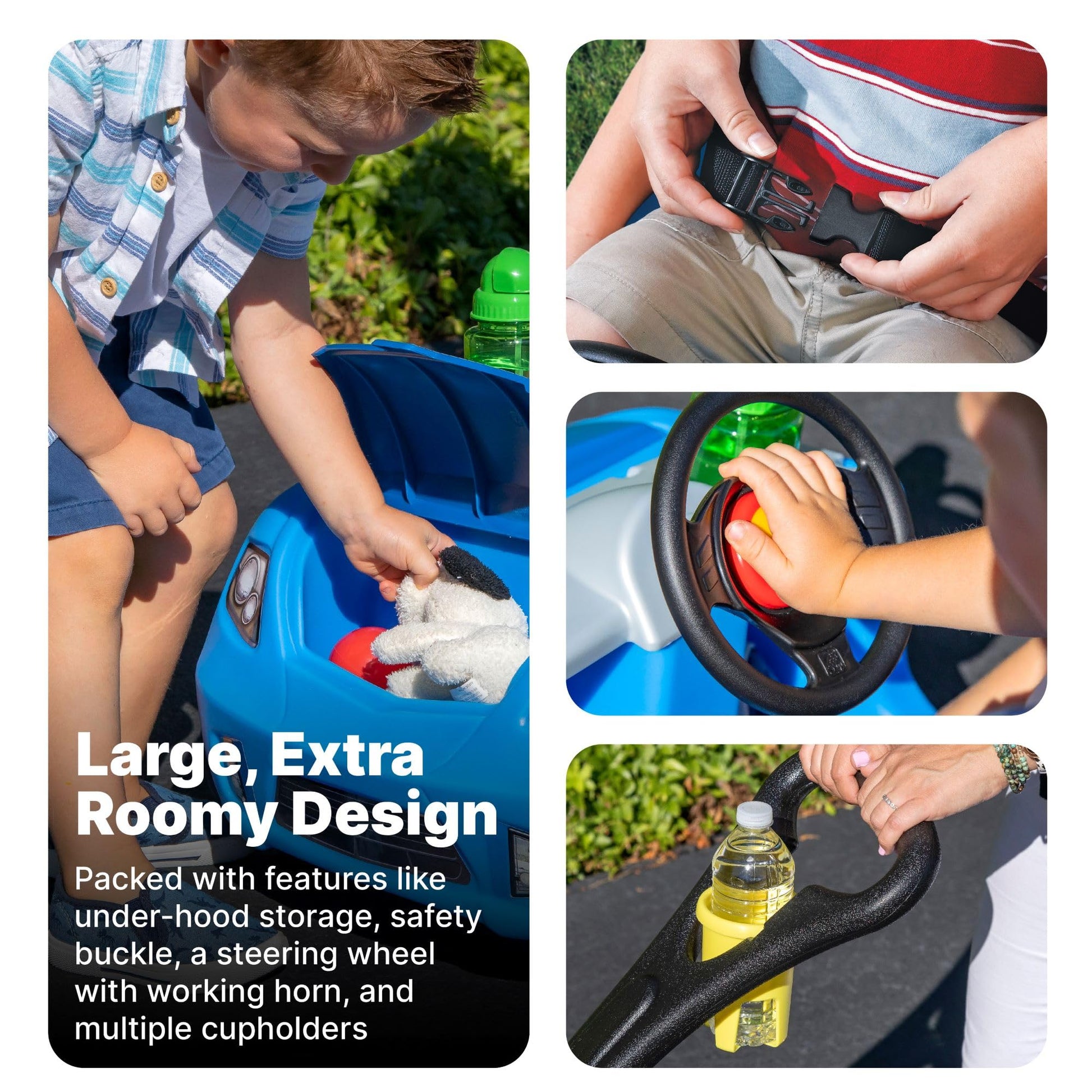 SAFE & FUN: Easy-latch adjustable seat belt for safety, real car horn and steering wheel, convenient cup holders, under-hood storage for snacks and toys.
