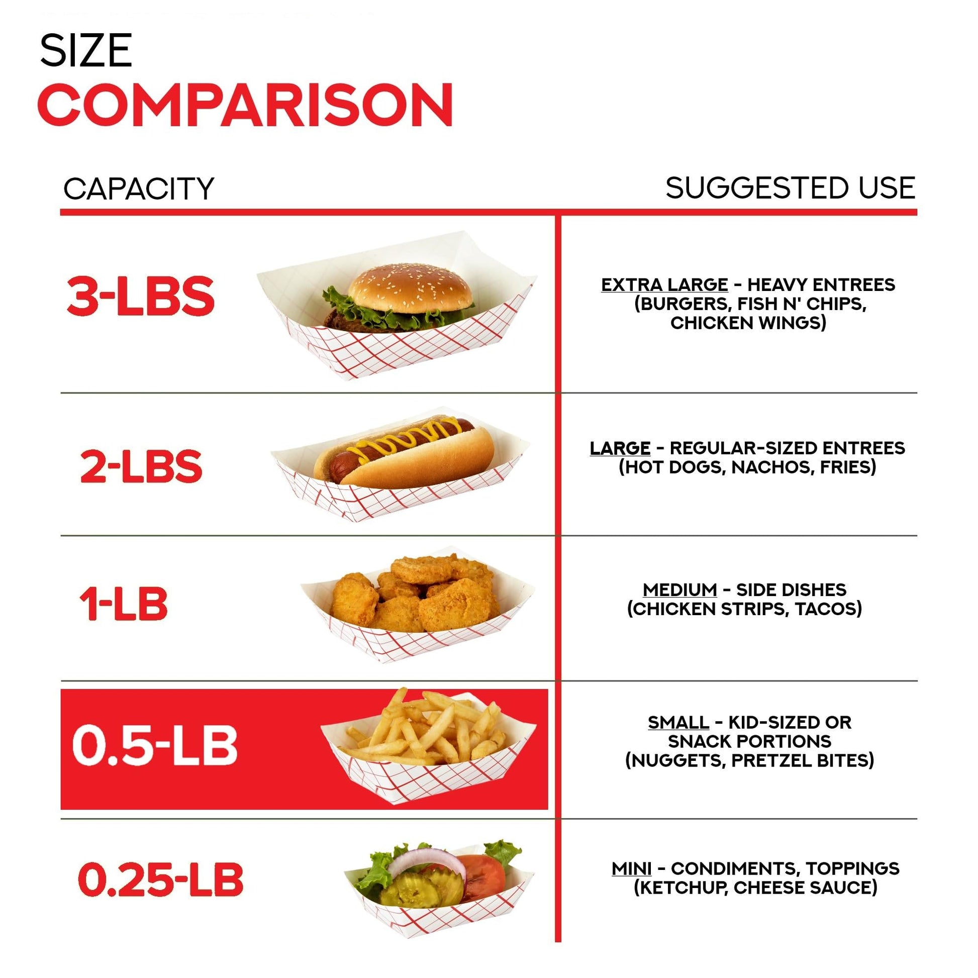 • .5 Lb Value Pack: Comes with 100 red and white checkered paper trays with a maximum food capacity of .5 pound. Measure 3.5” Bottom Length, 5.125” Top Length, 2.125” Bottom Width, 3.75” Top Width, 1.25” Height. Good for: side of fries, chips, nacho cheese.