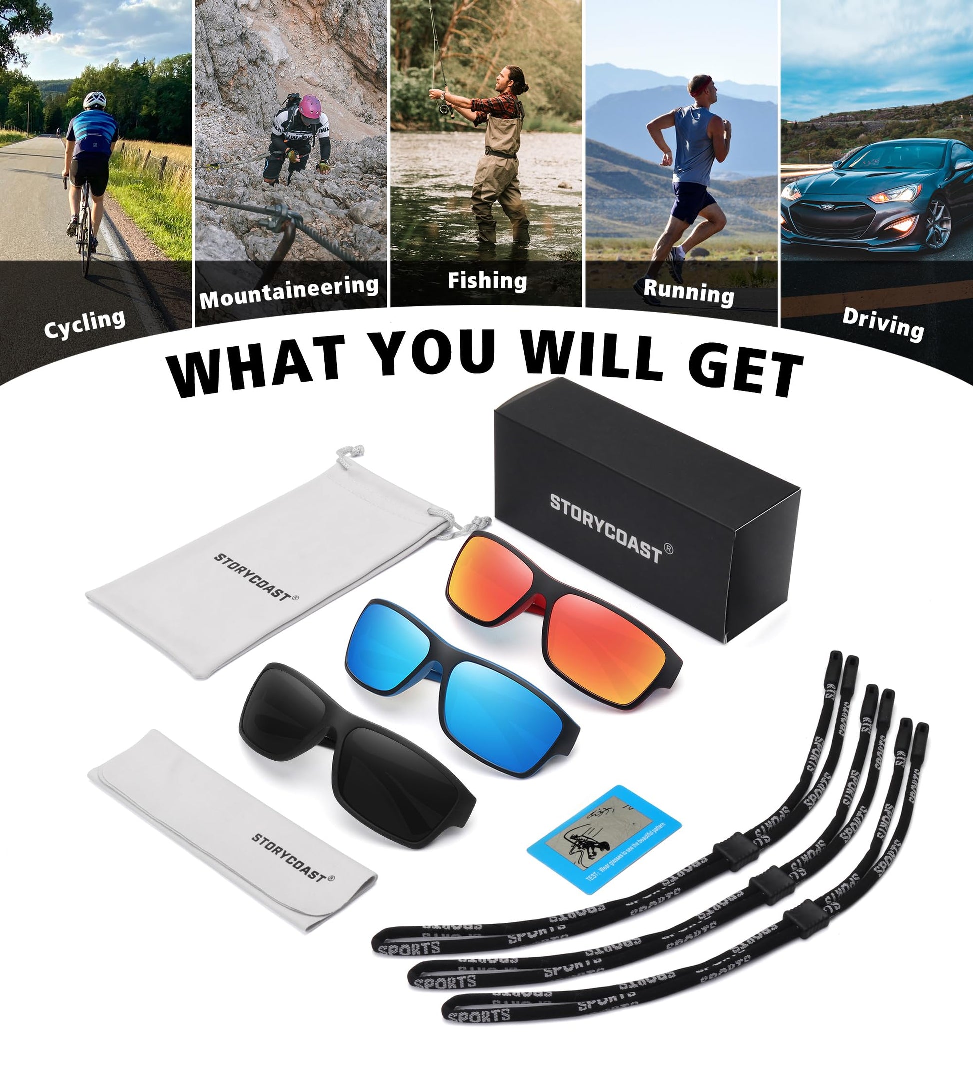 STORYCOAST Polarized Sports Sunglasses for Men Women Unbreakable Frame Cycling Fishing Driving 3Pack-Black+Red+Blue
