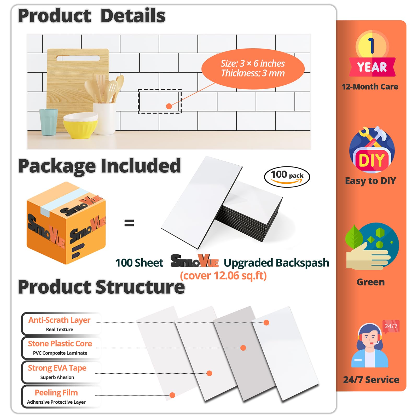 StyloVue 100 Pieces Peel and Stick Backsplash for Kitchen, 3" x 6" PVC Subway Tile 2025 Upgraded Glossy White with Dark Gray Grout Backsplash Stick on Tile Elevate Kitchen, Bathroom, Fireplace,RV